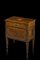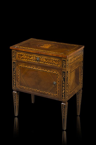 Comodino ad un'anta ed un cassetto lastronato in noce con piano filettato e decorato al centro da rosone con scena classica, gambe rastremate. Lombardia, secolo XVIII (cm 56x58x36) (difetti e restauri)