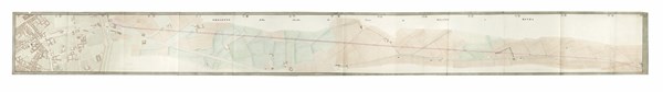 [SURVEY MAP - MILAN]. Handwritten and watercolor cadastral map, folded several times, on large format paper from the "Progetto della Strada di ferro da Milano a Monza" the railroad Milano-Monza, Plate I.a, from Milan to Sesto (8000x 822mm approx.). Edited by the engineer Giulio Sarti (1792 - 1866) and dated Milan, December 31, 1837. Excellent state of conservation (only some minor tears). With several "bolli straordinari" at the top