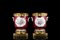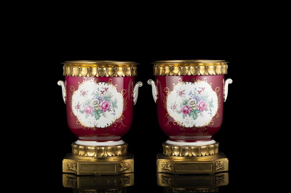 Manifattura francese, secolo XX. Coppia di vasi in porcellana "sangue di bue" centrati da riserve profilate in oro e decorate a fiori, anse in forma di foglie. Montati in bronzo dorato (h. tot cm 29) (lievi difetti)