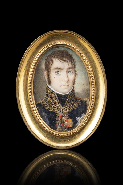 "Portrait of Eugenio Beauharnais General of Division of French empire" oval miniature (cm 4,5x3) Signed on the left "Gigola. F." Framed (minor defects)