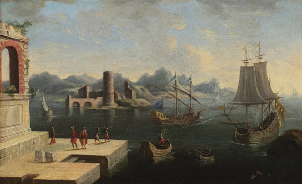 Imaginary view of an harbor with figures and sailing ships
