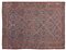 Decoro con file di medaglioni romboidali azzurri decorato con motivi romboidali geometrici nei toni del verde, rosa, blu e bianco. Fondo color rosso. Molteplici bordure di cui quella finale a motivo di cane che corre. (cm 380x263)