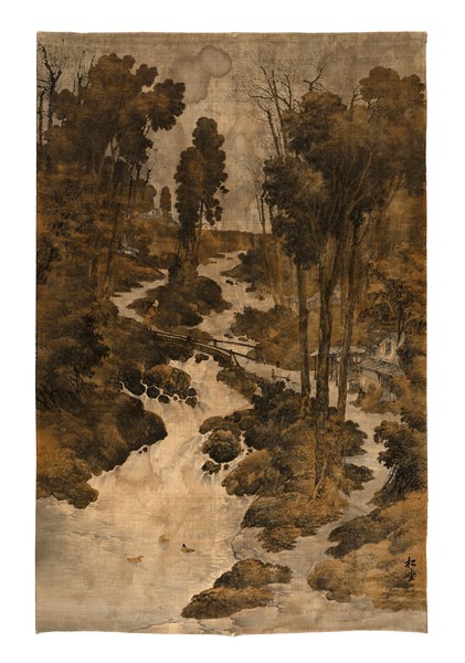 Arazzo in velluto di cotone e tessuto cannettilè dipinto a mano raffigurante paesaggio con fiume, ponticello ed alberi. Pittura di stile estemporaneo. Con fodera e siglato in basso a destra con due ideogrammi cinesi. Cina, Dinastia Quing. Secolo XIX (167x66) (lievi difetti e strappi alle testate)