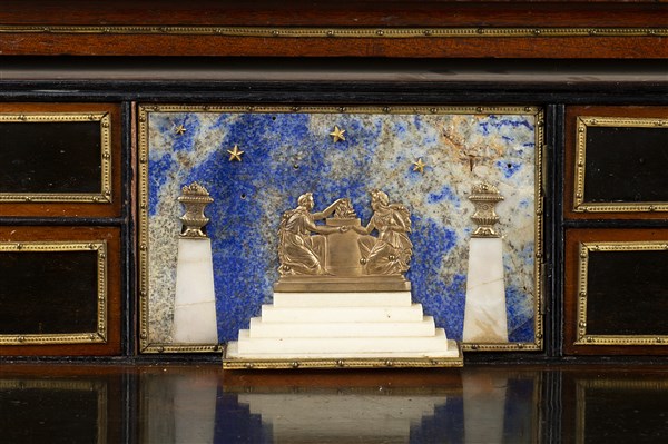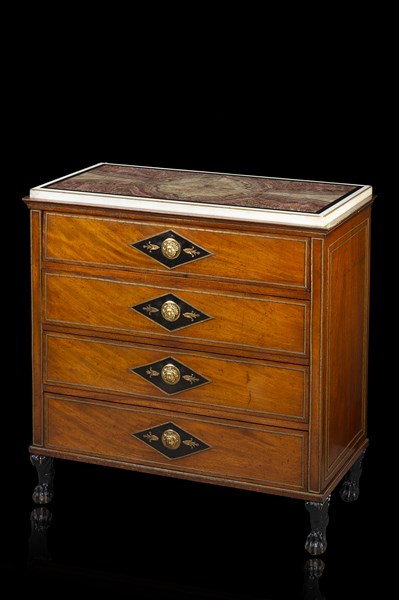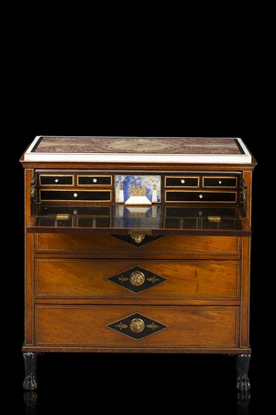 Cassettoncino in mogano, fronte a quattro cassetti parzialmente ebanizzati di cui quello sottopiano con scarabattolo celante cassettini e vano con anta a scena classica in paesaggio notturno in pietre dure e bronzo. Guarnizioni in bronzo e metallo dorato a fregi e volti. Piedi ferini in legno intagliato ed ebanizzato. Piano lastronato in marmo e alabastro fiorito. Secolo XIX (cm 89x93,5x43,5) (difetti e restauri)