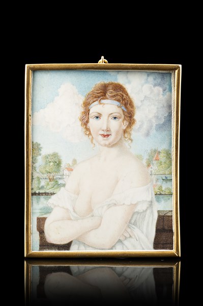 "Ritratto di fanciulla in un paesaggio" miniatura su avorio (cm 9x7) Inscritta al retro. In cornice (difetti)