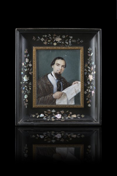 P. Nizzola (Secolo XIX) "Ritratto di Vincenzo Torelli fondatore di Omnibus (?)" miniatura su avorio (cm 9x7,5) Firmata e datata 1847 a sinistra. In cornice francese del secolo XIX intarsiata in madreperla. Timbri al retro (difetti)