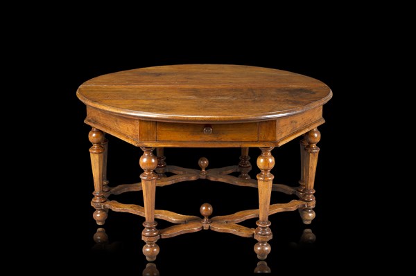 Coppia di tavoli consolle in noce, due cassetti nella fascia, gambe tornite e sfaccettate unite da traverse sagomate decorate da elemento decorativo (cm 142x82x140) (difetti e restauri, trasformati in tavolo allungabile in epoca posteriore)
