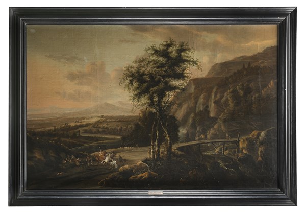 Philips Wouwerman (attr.) Paesaggio con cavalieri e dame Olio su tela, cm 106x1
