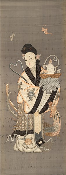 Ricamo in seta a punto lanciato nei toni del rosa, beige, rosa carico, nocciola, azzurro e nero per i capelli e la bordatura del kimono. Raffigurante Guanjn che regge un piccolo vassoio contenente la pesca dei mille anni ed il nettare dell'immortalità. Ai piedi della divinità un'araba fenice. Ricamato su un fondo color piombo decorato con motivi floreali in file geometriche tono su tono. Cina, 1870 ca. In cornice (cm 171x68) (difetti)