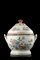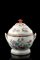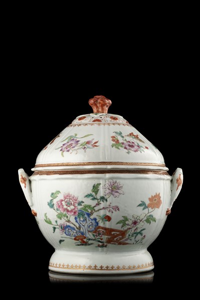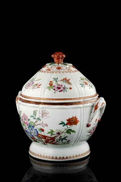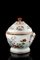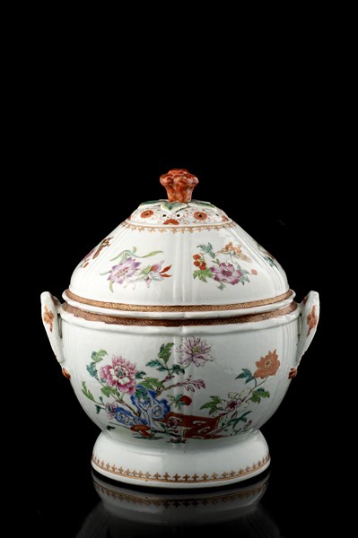 Zuppiera con coperchio in porcellana decorata in policromia a fiori e doratura,