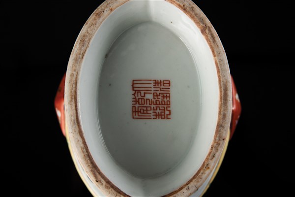 Vaso biansato in porcellana policroma, decorato a riserve con personaggi e motivi floreali, marchio apocrifo Qianlong
