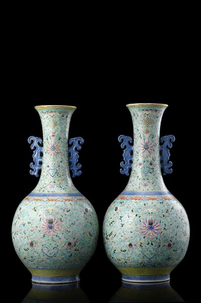 Coppia di vasi a bottiglia in porcellana Famiglia Rosa, anse a draghi stilizzat