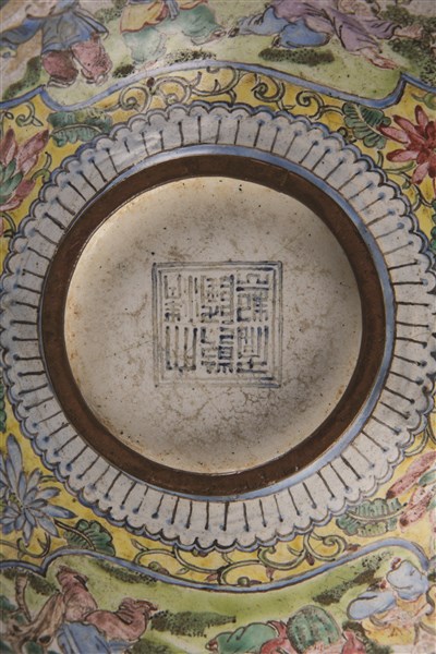 Tazza con coperchio in smalto Canton a fondo giallo, decoro a riserve floreali e con figure, marchio apocrifo Qianlong