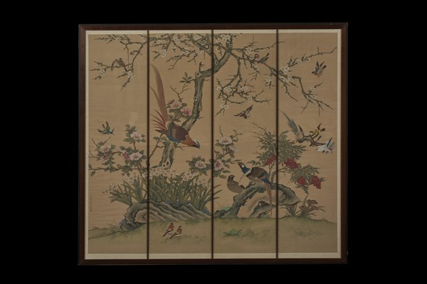 Dipinto su seta diviso in quattro sezioni raffigurante volatili in paesaggio con rami fioriti, reca sigillo e iscrizione in basso a sinistra con firma Wang Zheng, in cornice (lievi difetti)