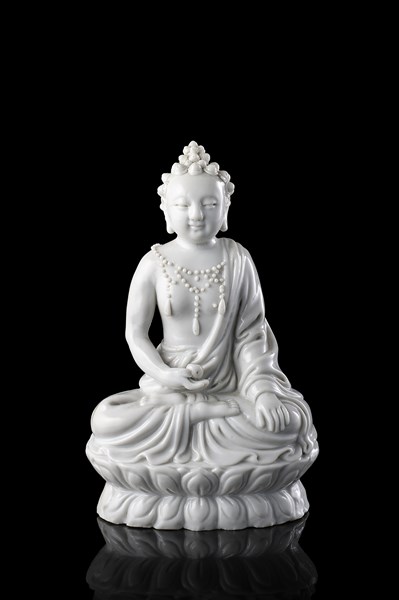 Lot 1040 | Figura di Bodhisattva in porcellana blanc de chine, in posizione seduta e regge
