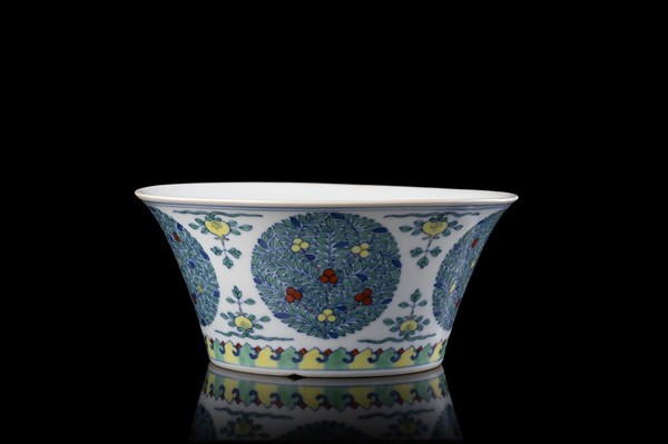 A doucai porcelain medallion bowl, decorated with roundels of fruiting trees separated by pomegranates sprays above a border of overlapping leaves (defects and restorations)