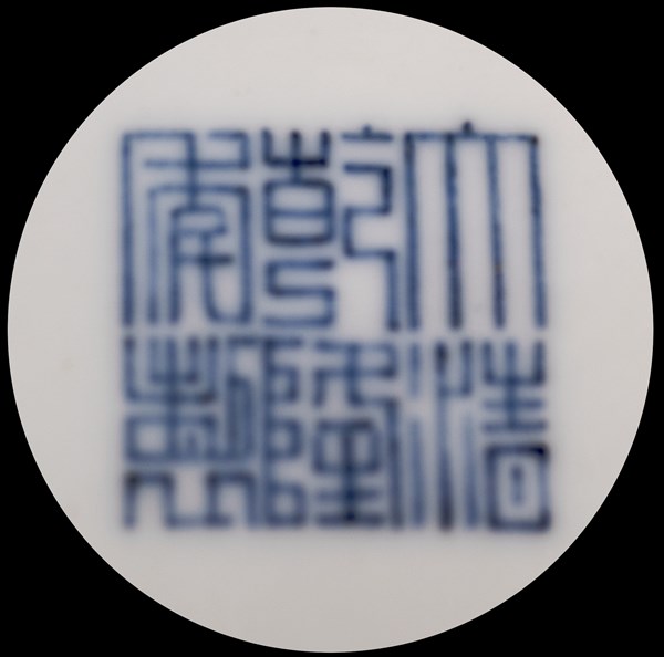 Ciotola in porcellana a smalto doucai, decorata a medaglioni con tralci e frutta separati da decori con melograni sopra un bordo a foglie sovrapposte (difetti e restauri)