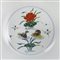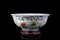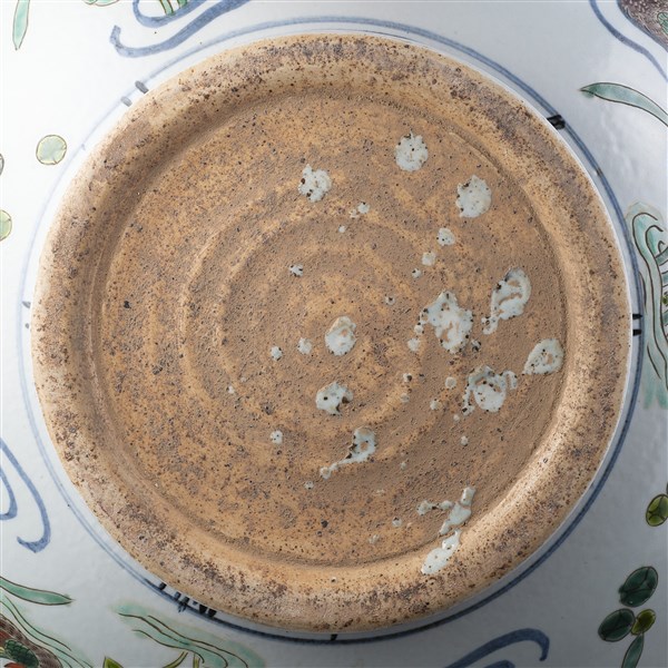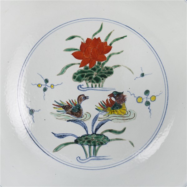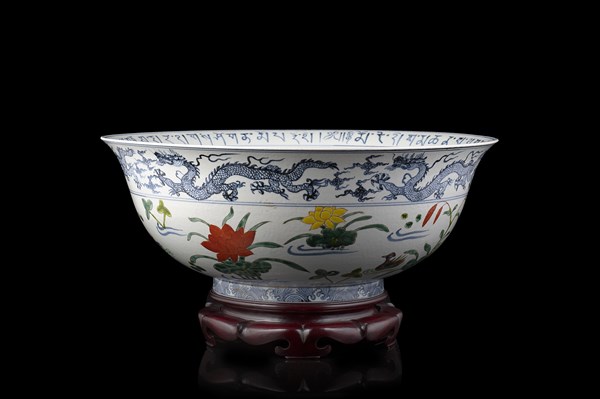 Grande ciotola in porcellana doucai, il bordo esterno decorato a draghi bianchi e blu, il corpo a motivi floreali policromi ed anatre; il bordo interno decorato a caratteri cinesi arcaici, il fondo con scena policroma di giardino, base in legno