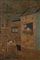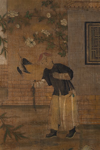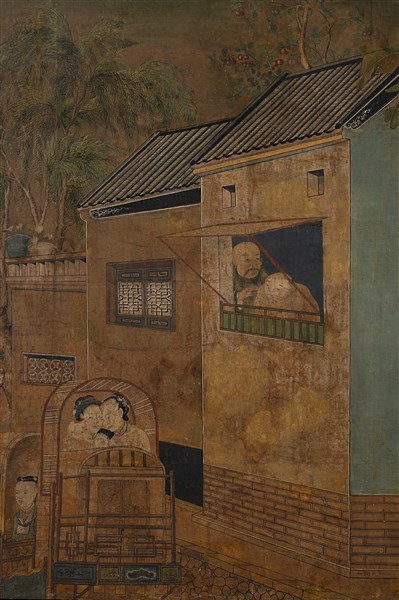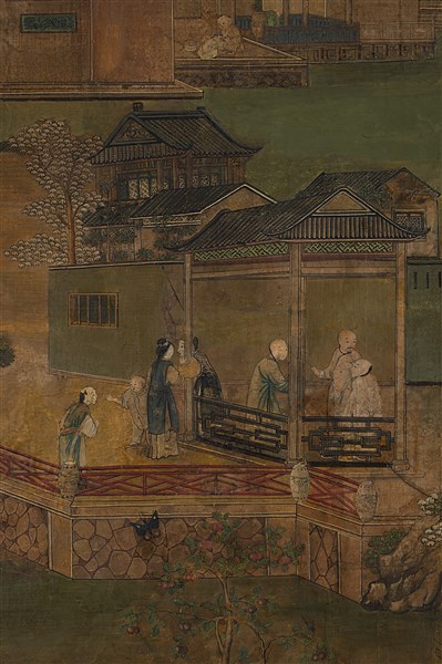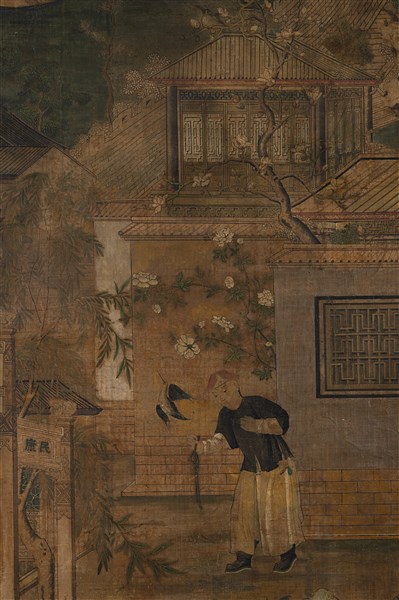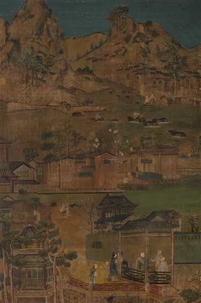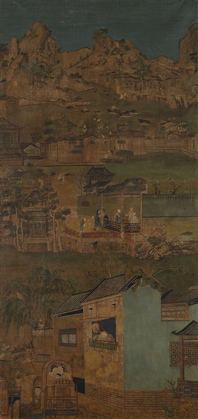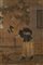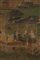 Due pannelli da parete dipinti con paesaggio montano con fiume e figure tra padiglioni, inchiostro e colori su carta intelata (difetti)