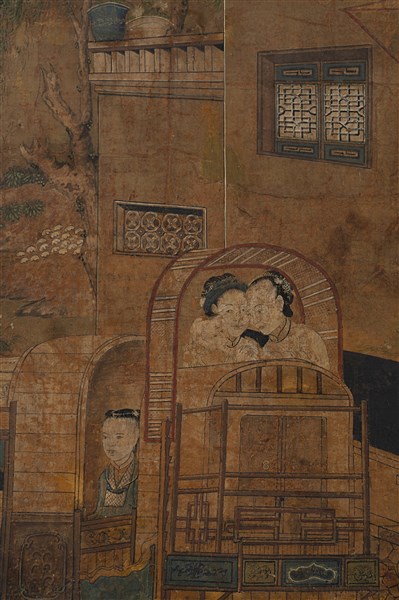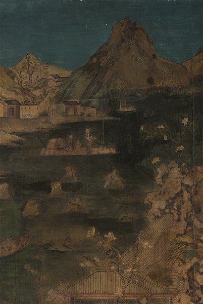 Two wall pannels painted with a mountain landscape, a river and some figures between pavillons, ink and colors on lined paper (defects)
