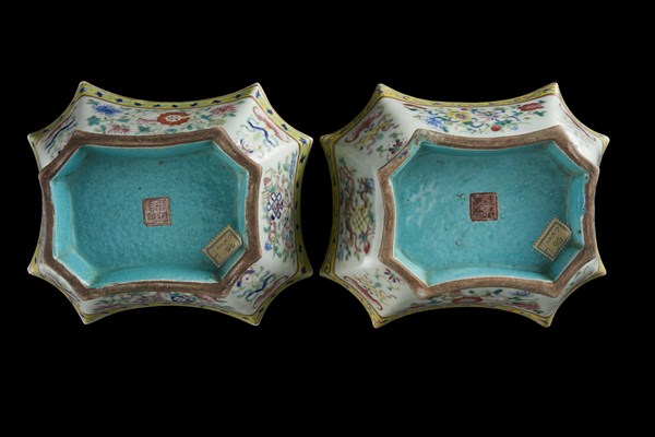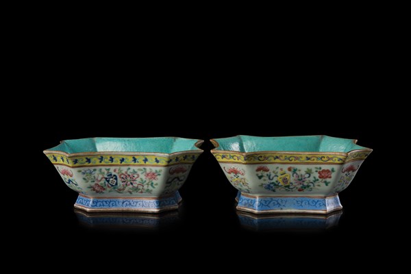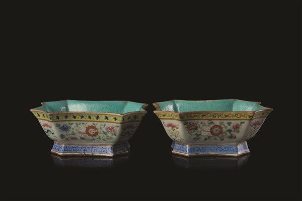 Due ciotole in porcellana di forma sagomata a smalto policromo decorate con mot