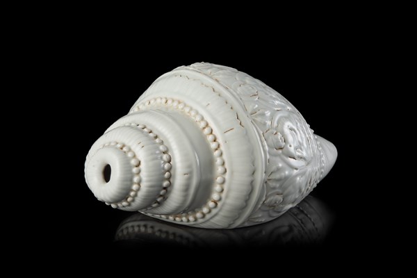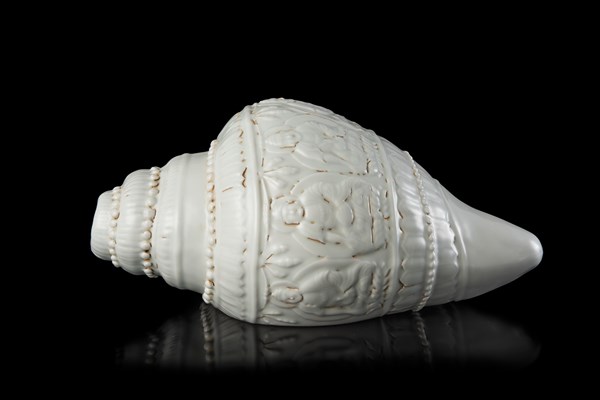Grande conchiglia rituale 'Shankha' in porcellana bianca, decorata con figure d