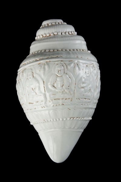 Grande conchiglia rituale 'Shankha' in porcellana bianca, decorata con figure di Buddha assisi