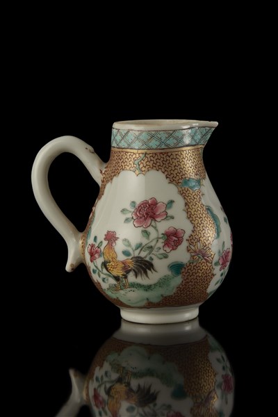 Piccolo versatoio in porcellana policroma, Famiglia Rosa, decorato a riserve con galli (lievi difetti)