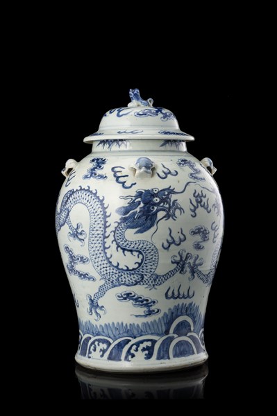 Potiche con coperchio in porcellana bianca e blu con decoro a dragoni (lievi di