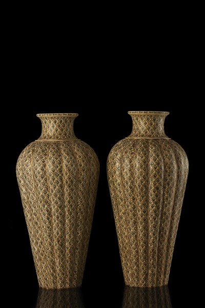 Coppia di vasi in avorio decorati a motivi floreali policromi e parzialmente dorati