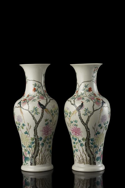 Coppia di vasi in porcellana bianca decorata con arbusti di melograno, fiori e