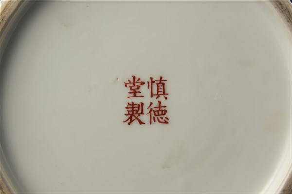 Coppia di vasi in porcellana bianca decorata con arbusti di melograno, fiori e uccelli. Marchio apocrifo Shen De Tang Zhi (difetti)