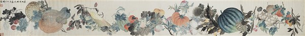 A painting of fruit and vegetables, with inscriptions and seals, ink and colours on paper, mounted and framed