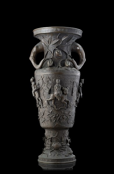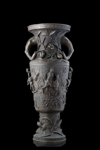 Grande vaso in bronzo decorato con figure a rilievo con anse fitomorfe (difetti