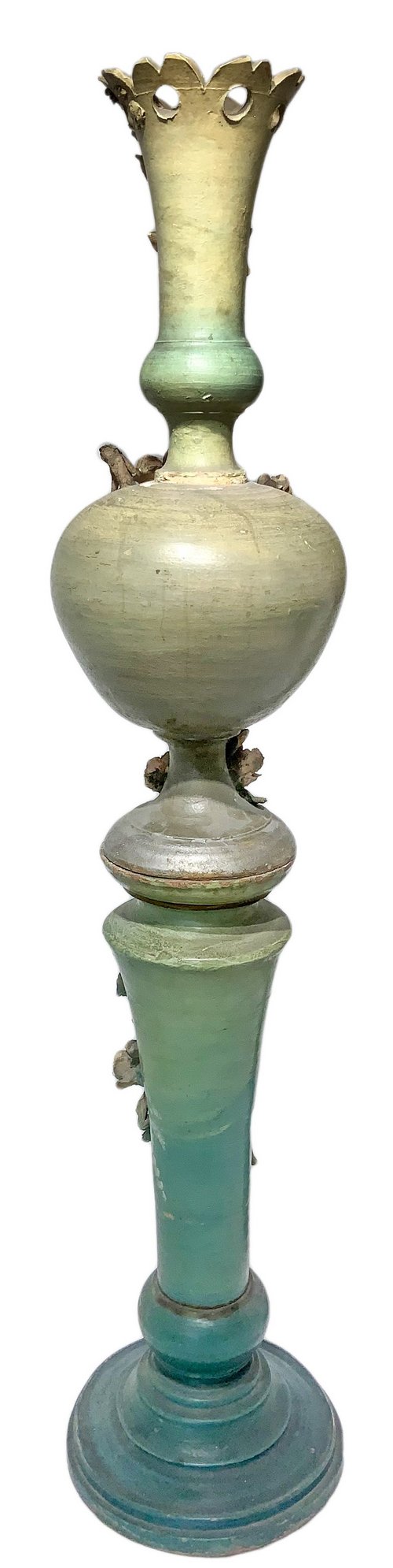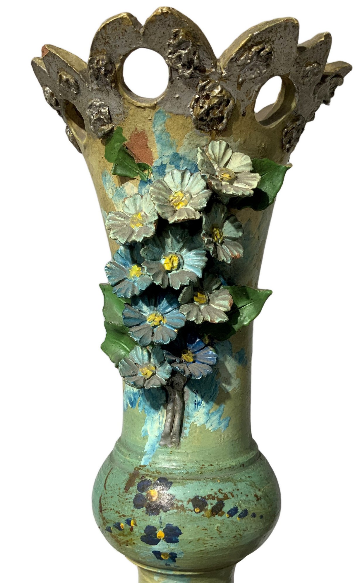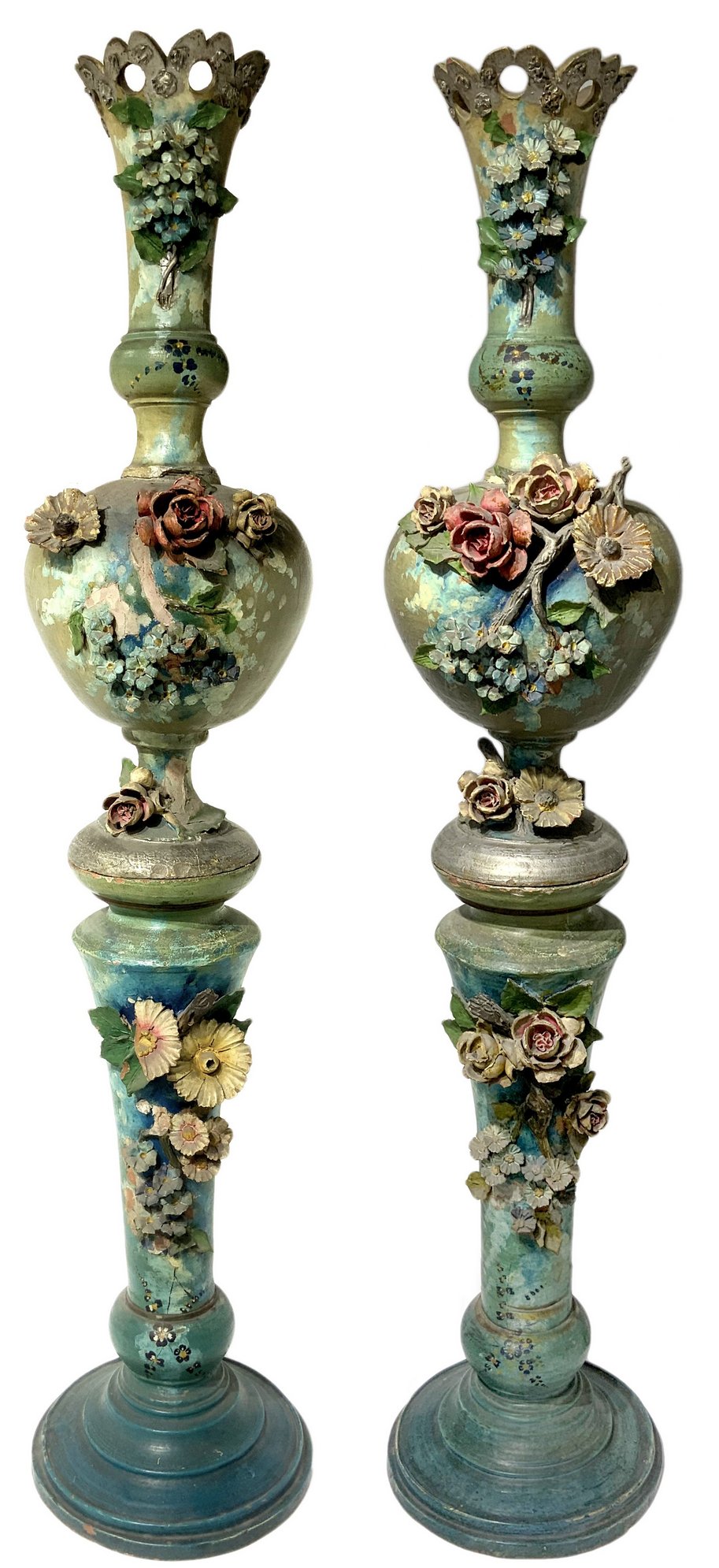 Coppia di vasi napoletani a due corpi, in cotto con decori floreali, secolo XIX. H cm 166. Mancanze nei fiori e nelle foglie.
