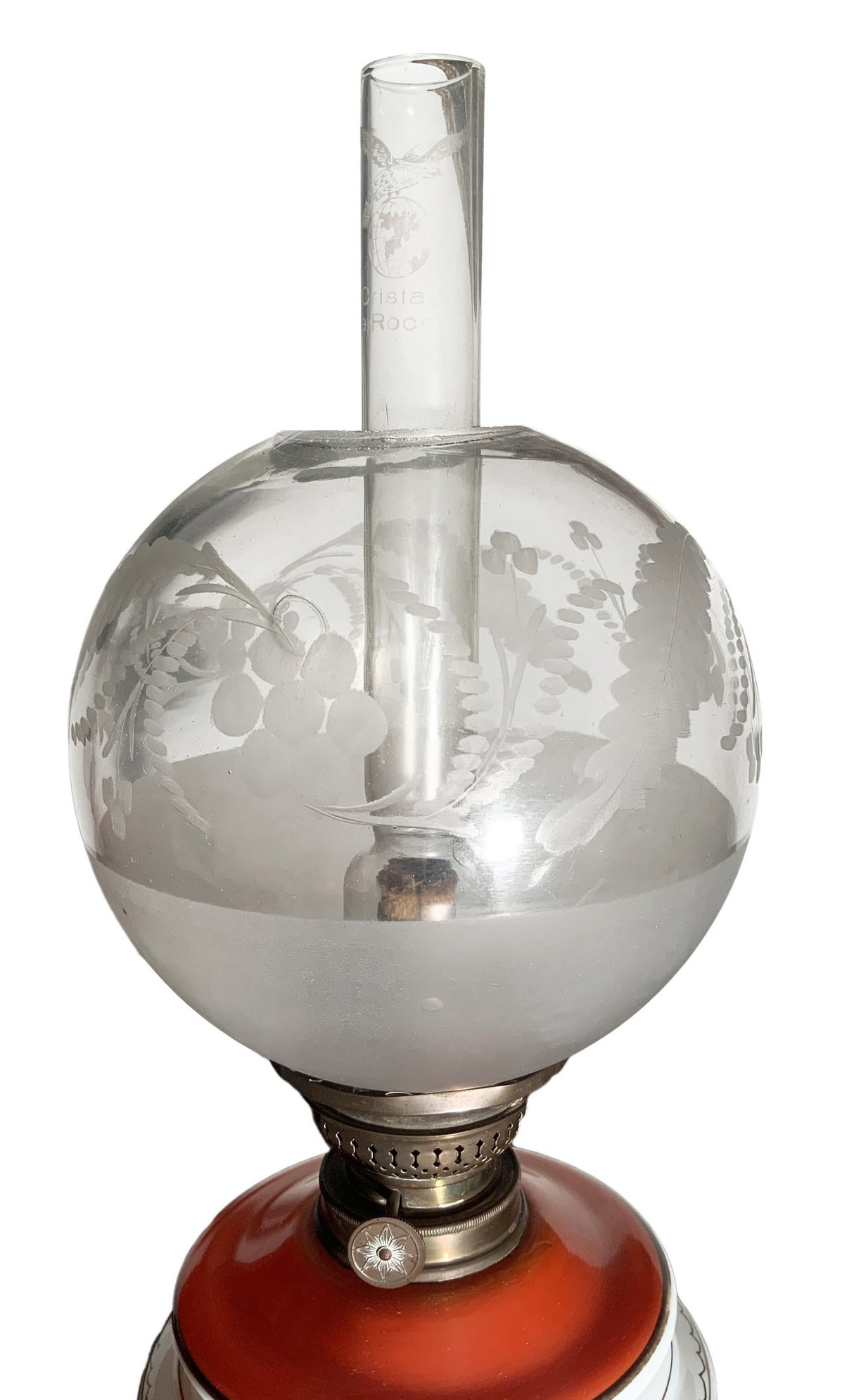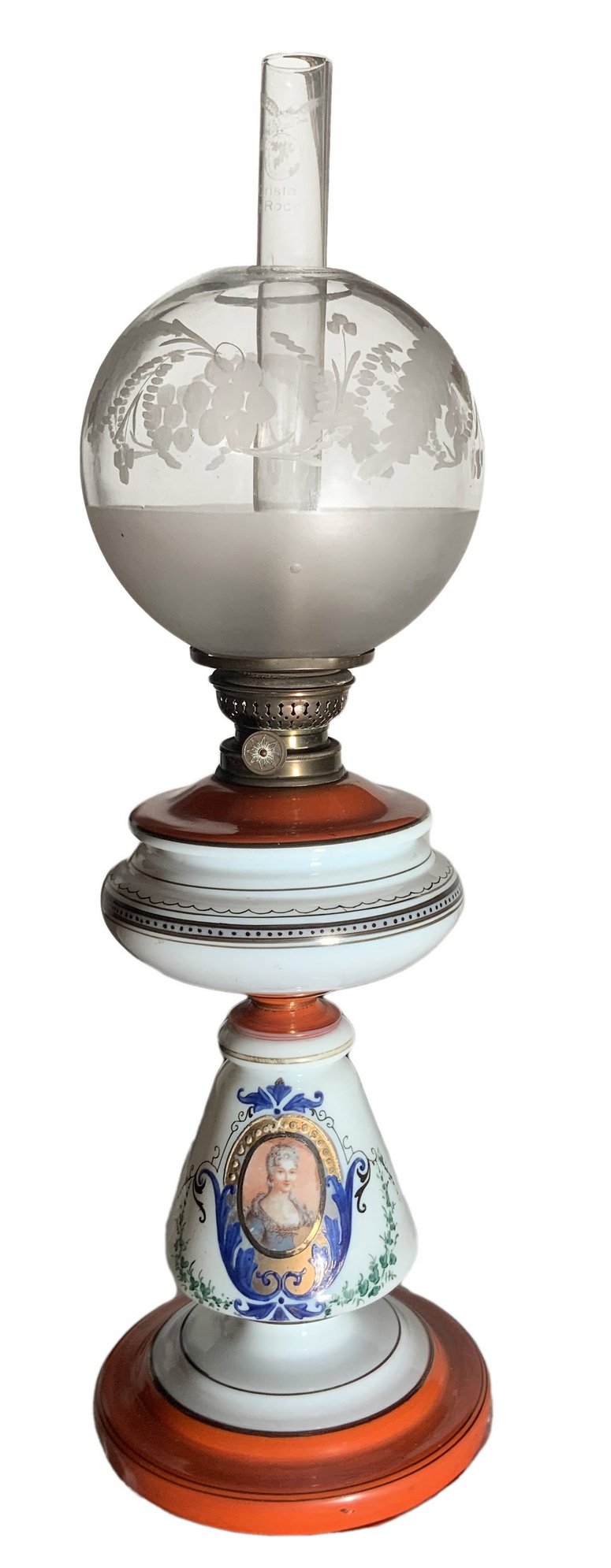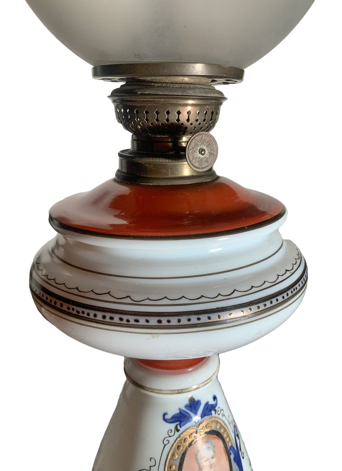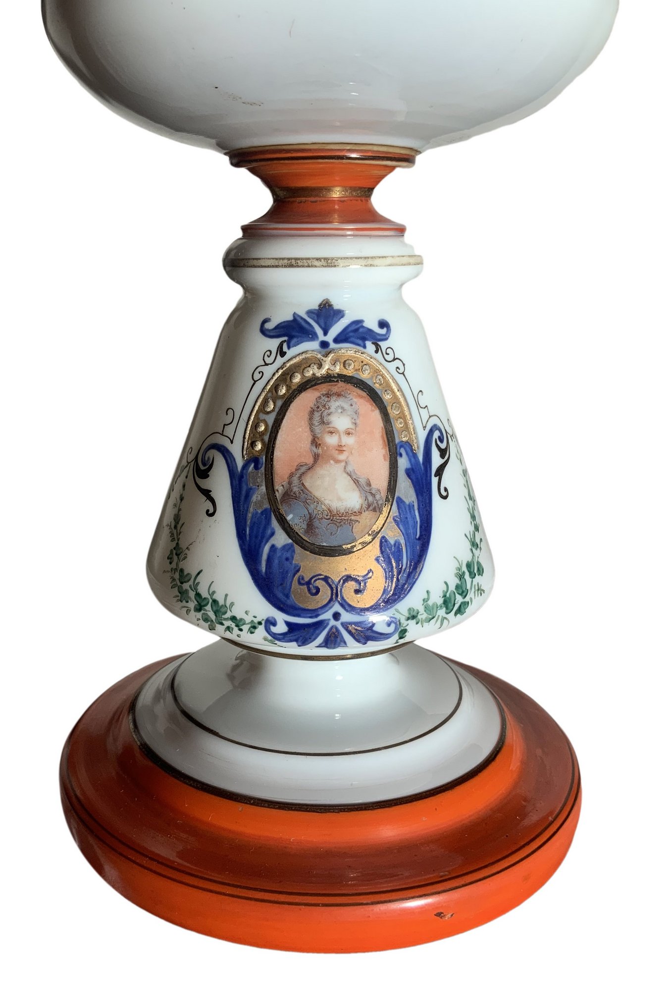 Lume in opaline con base di colore arancione con cameo raffigurante volto di nobildonna, fine XIX secolo. H cm 55