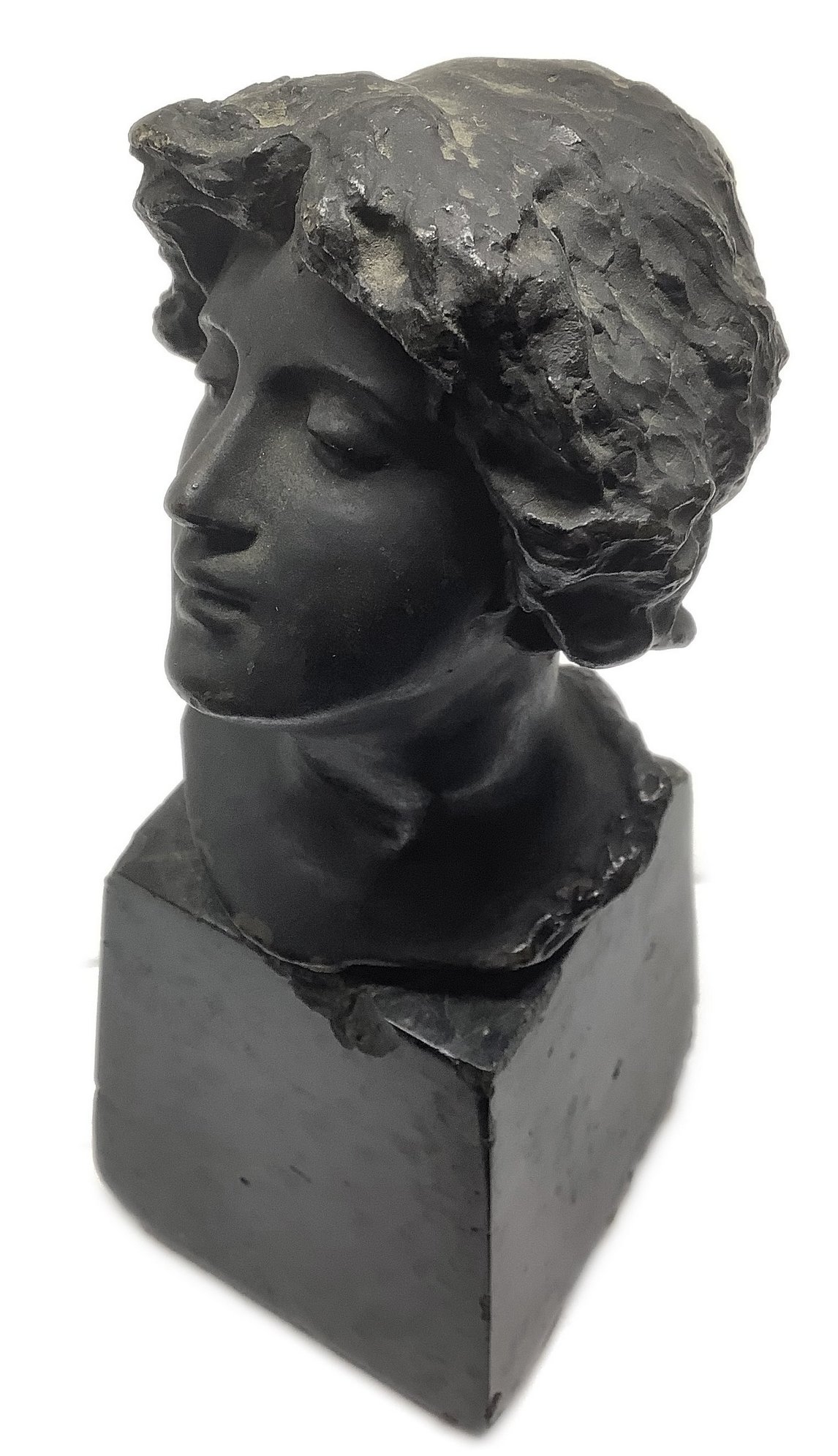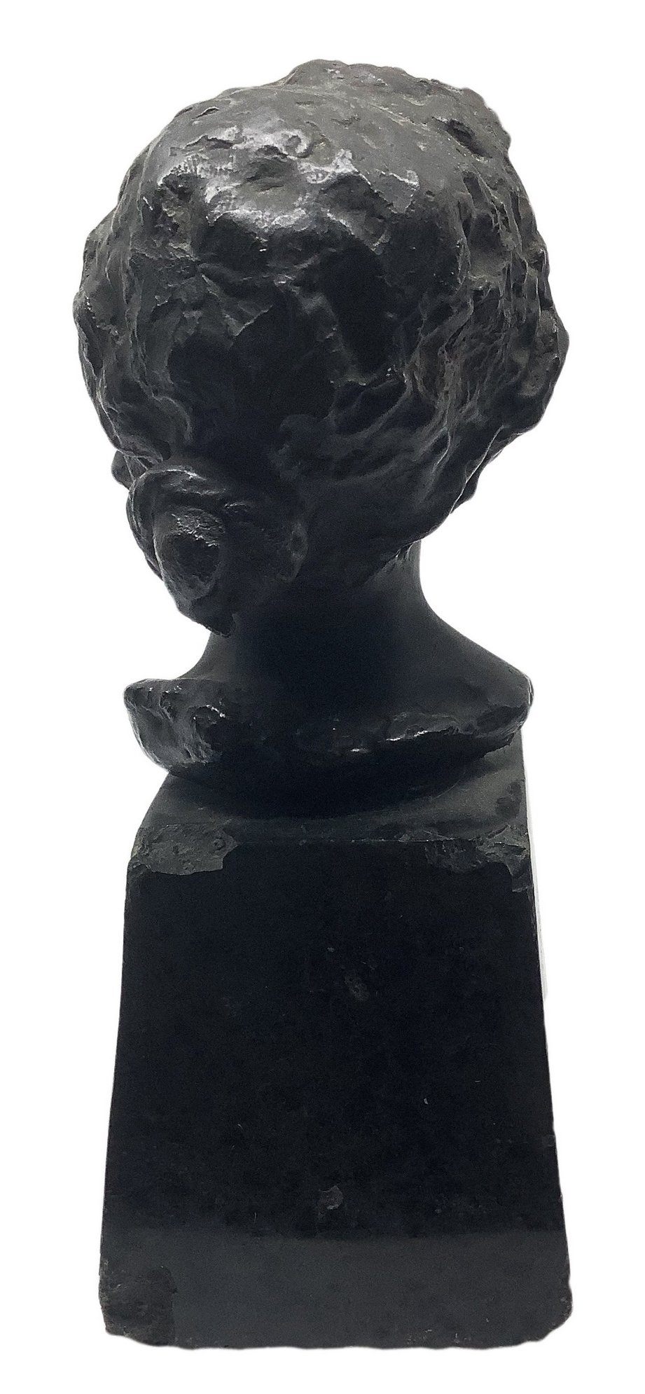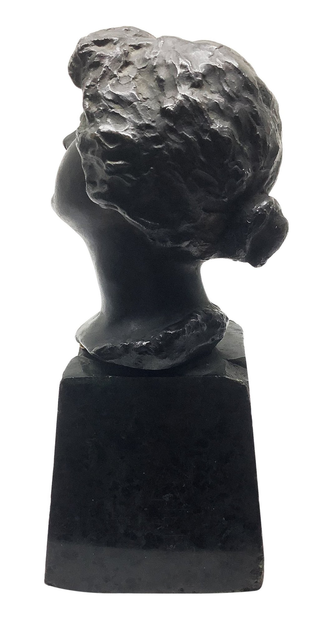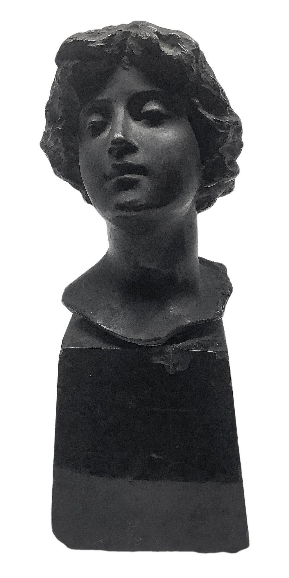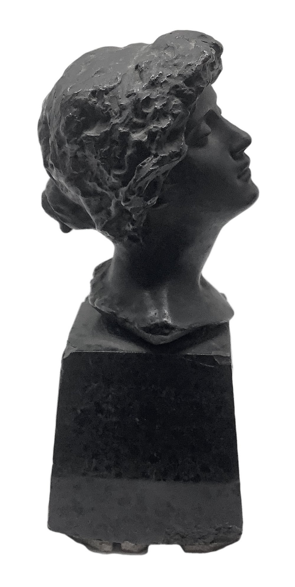 Bronzo a cera persa di testa di giovane donna. Base troncopiramidale in marmo grigio-nero. H cm 16. Piccola sbeccatura alla base