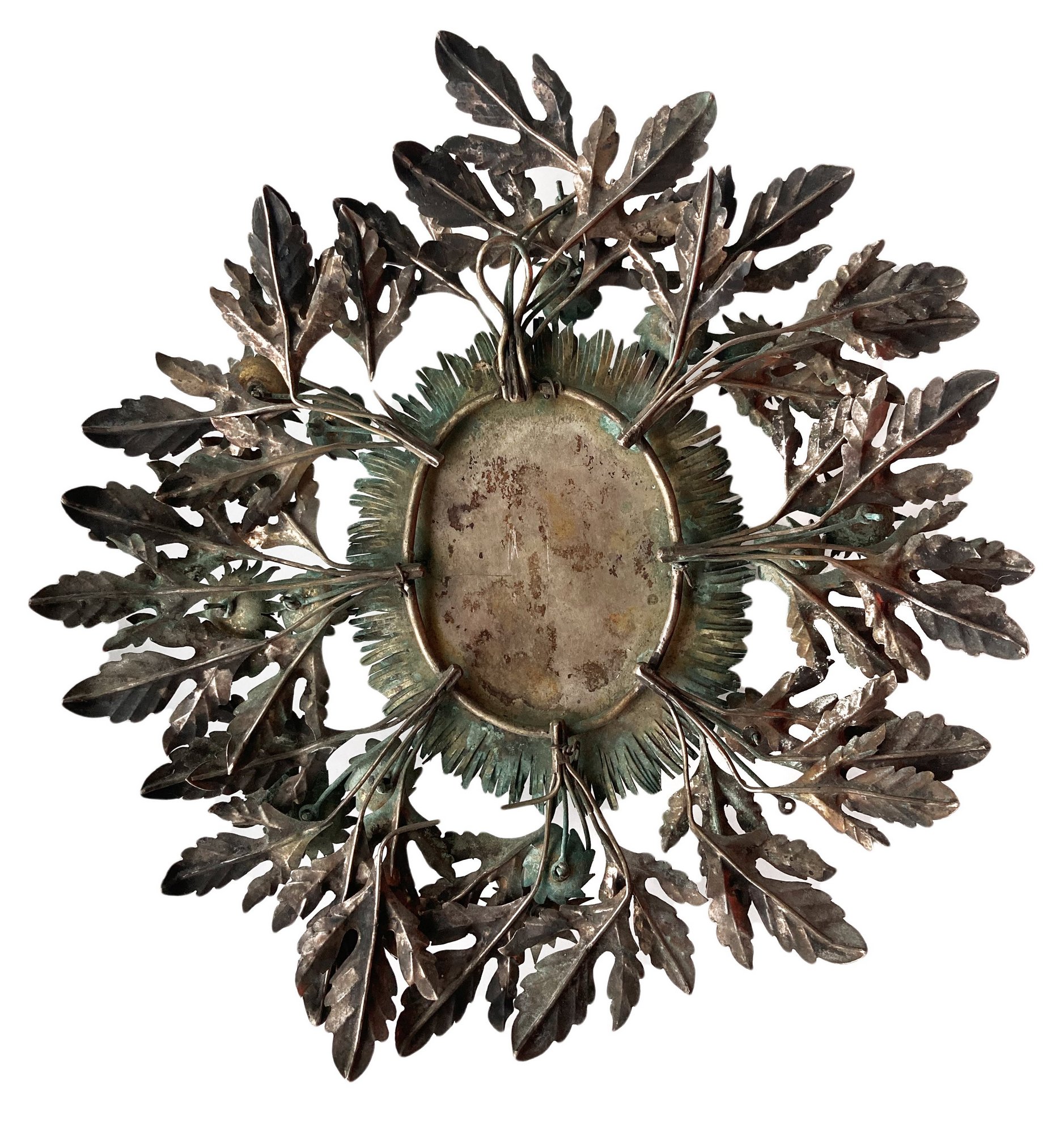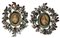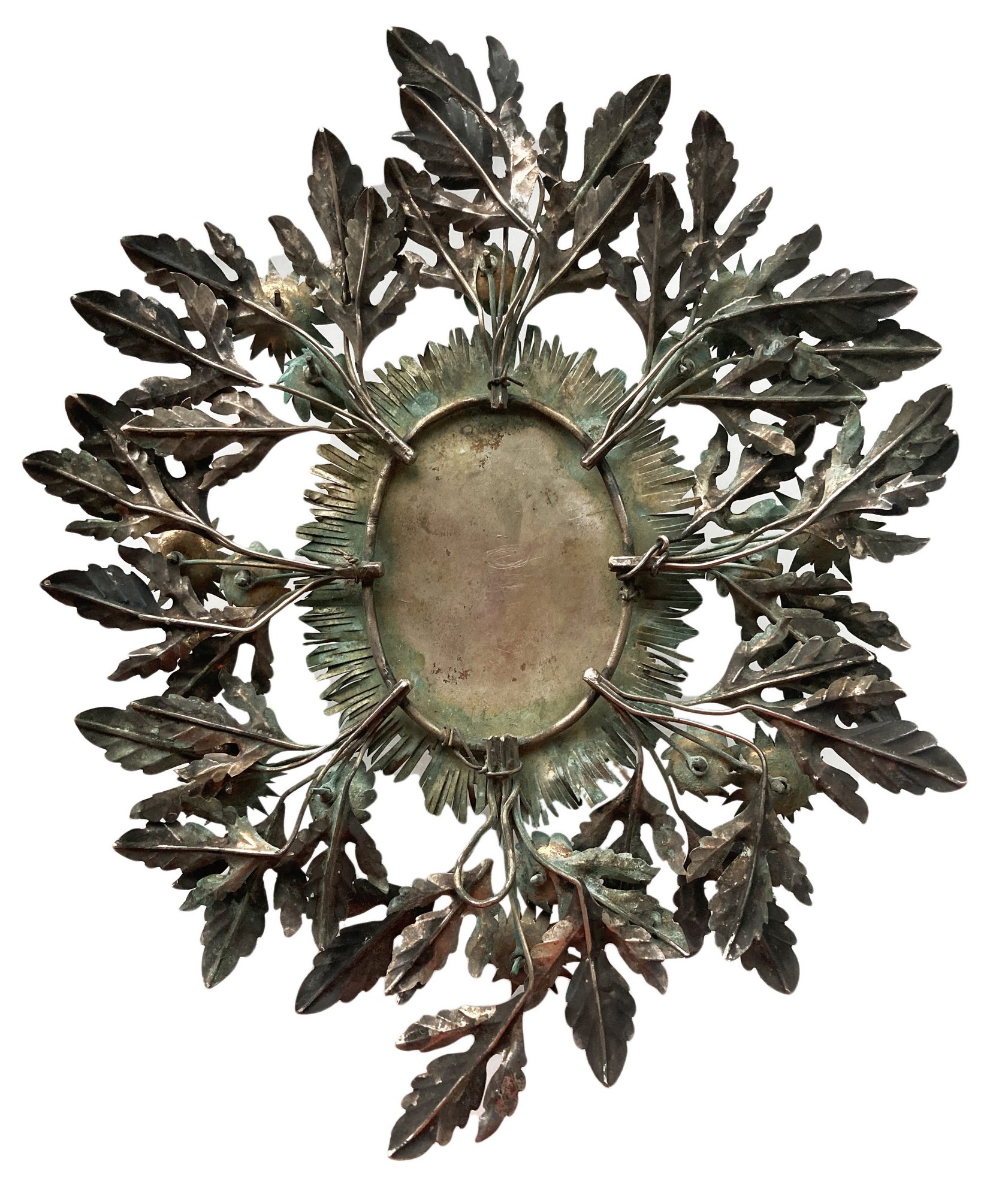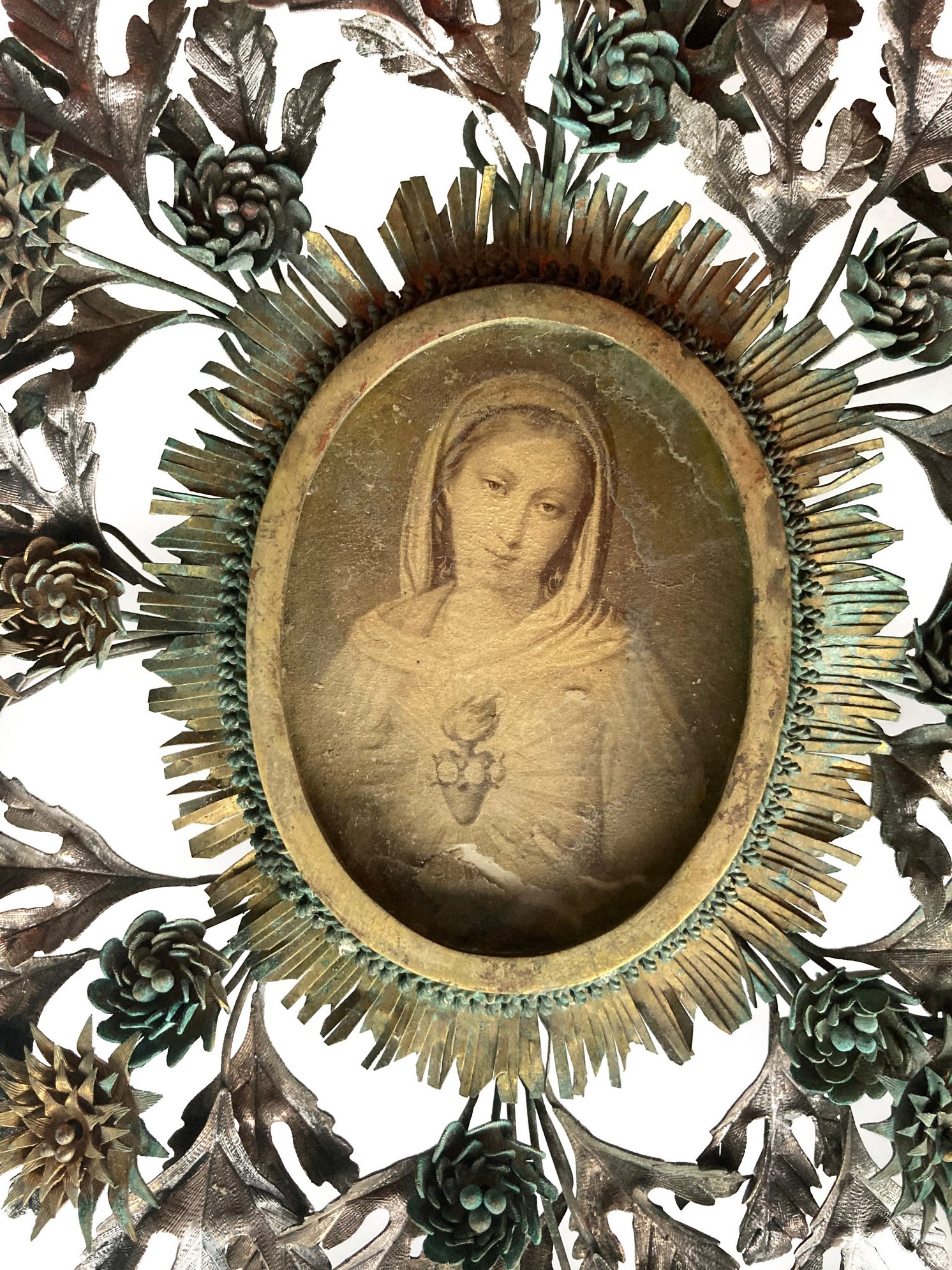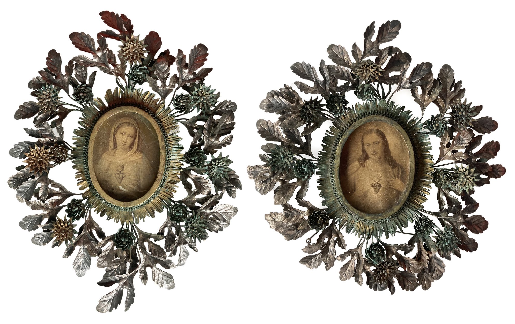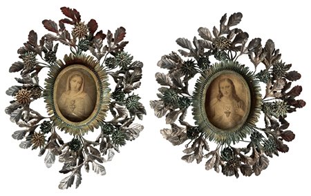 Due piccoli capezzali in metallo di ottone e argento con Sacro cuore di Gesù e Vergine Maria. Decorazione e lavorazione Trapani, Sicilia, 1780/1790. Cm 18x16. Varie mancanze.