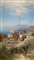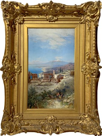 Dipinto olio raffigurante veduta dell’Etna dal Teatro Greco di Taormina, William Rickarby Miller 1818-1893. Cm 55x34, in bella cornice in legno dorato cm 90x65. Firmato in basso a destra e datato 90.