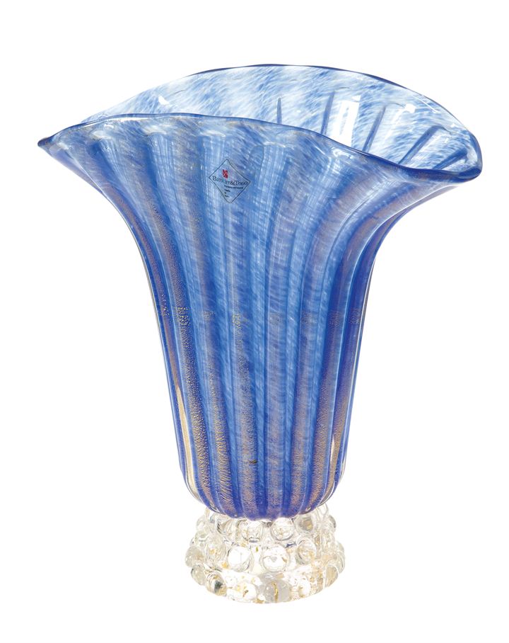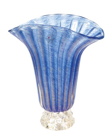 BAROVIER & TOSO Vaso a ventaglio in vetro azzurro e foglia oro, base a lenti...
