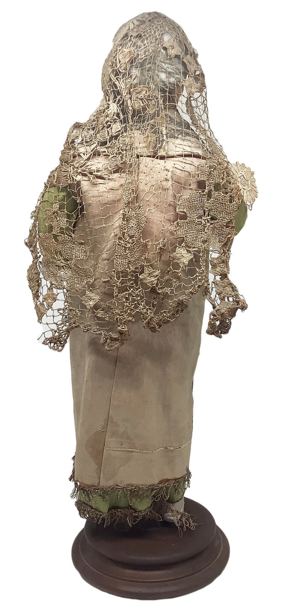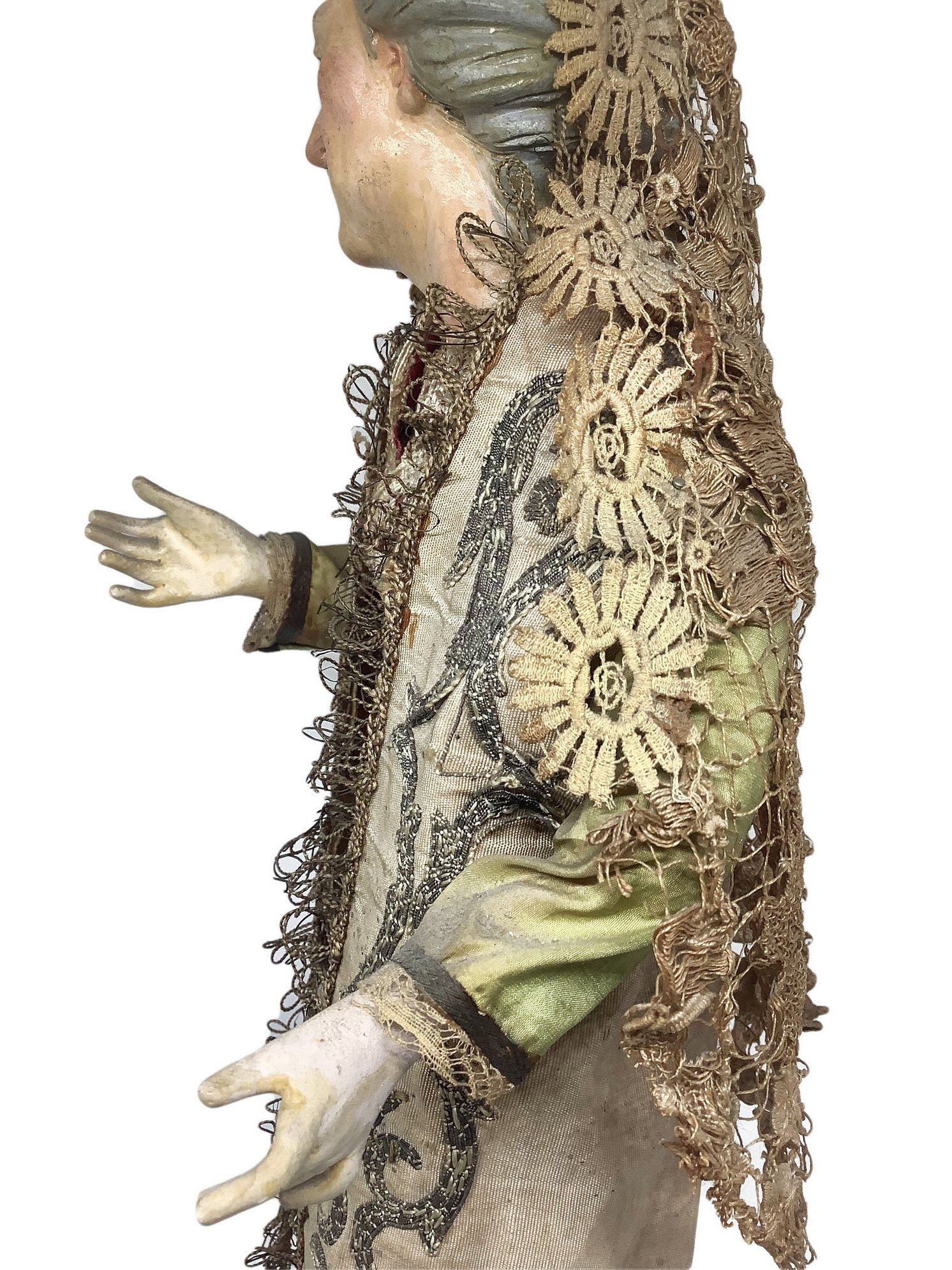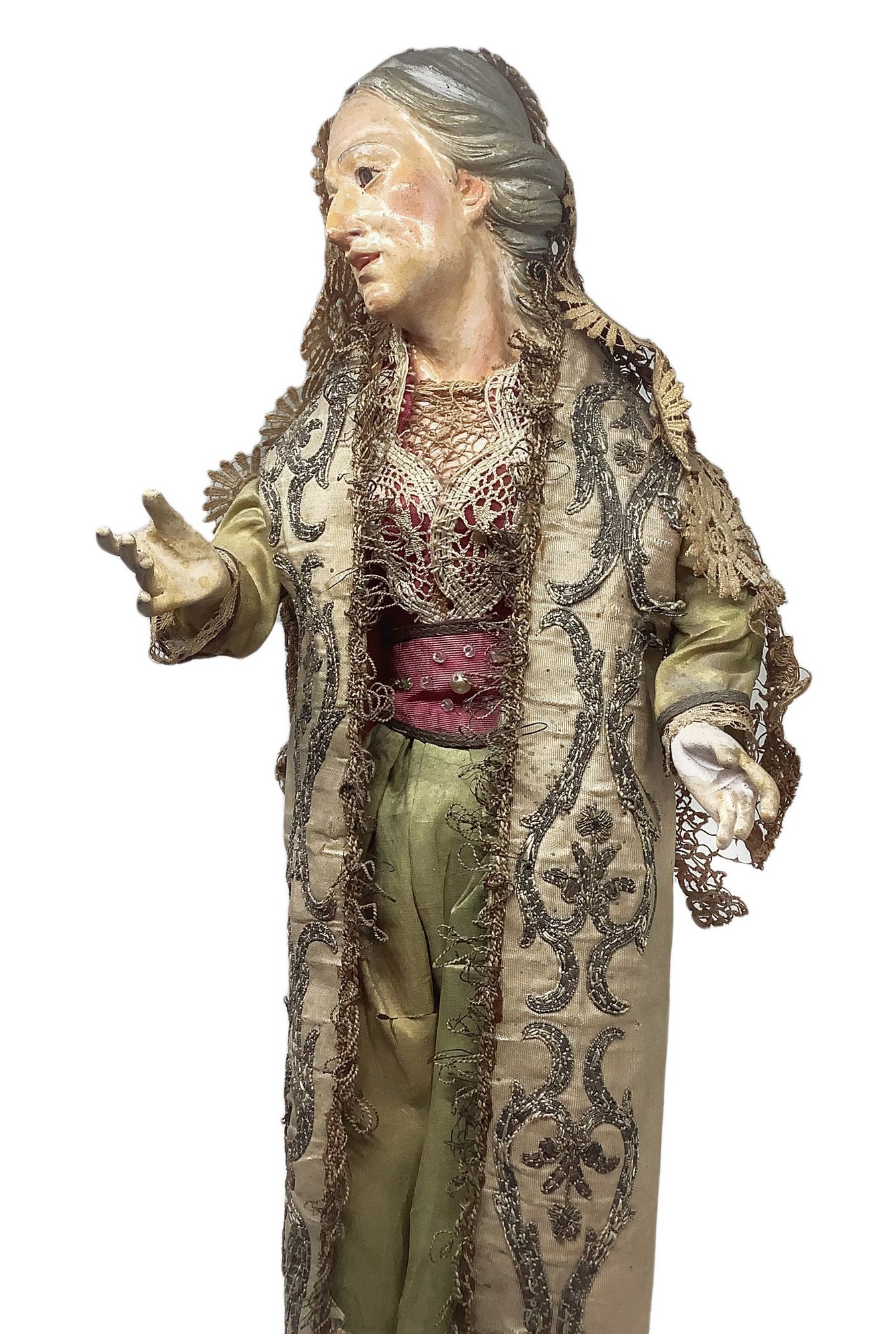Statuetta napoletana raffigurante Sant’Anna, fine XVIII secolo. Occhi di vetro, viso, mani e piedi in terracotta. Base in legno. Vestiti sdruciti. H cm 36.