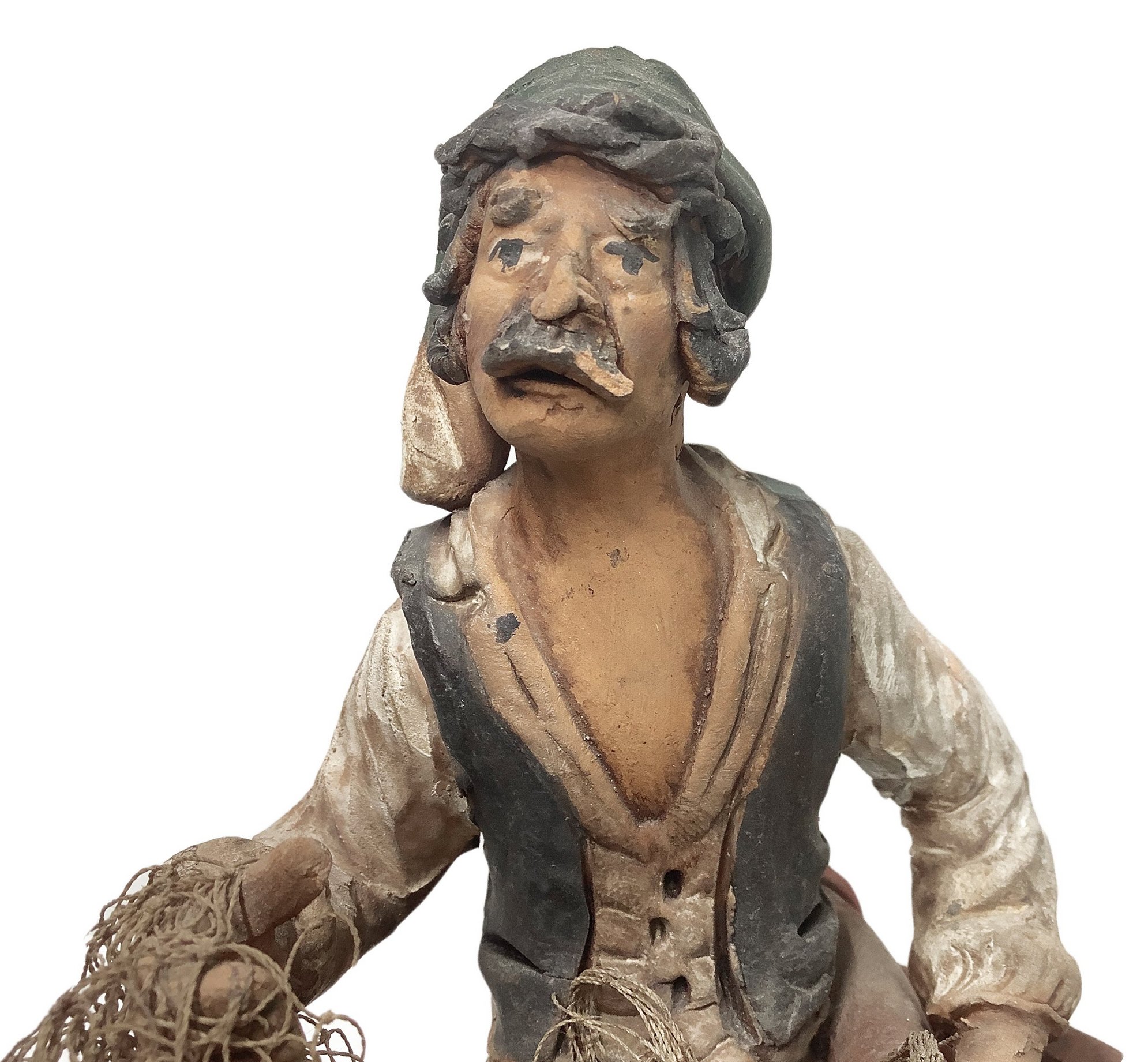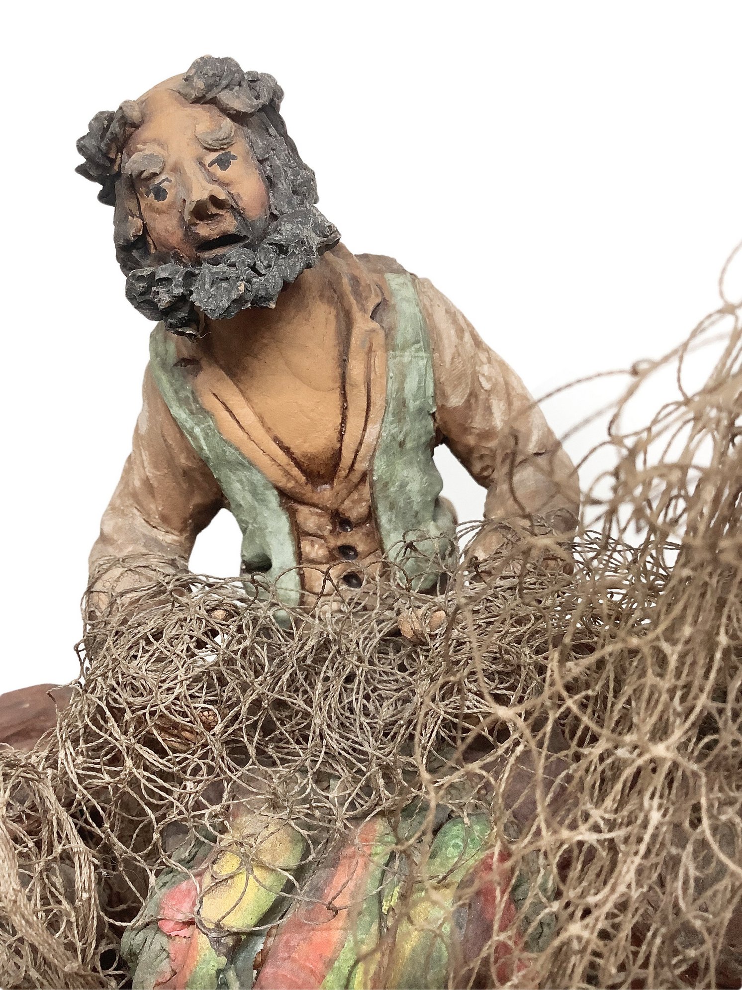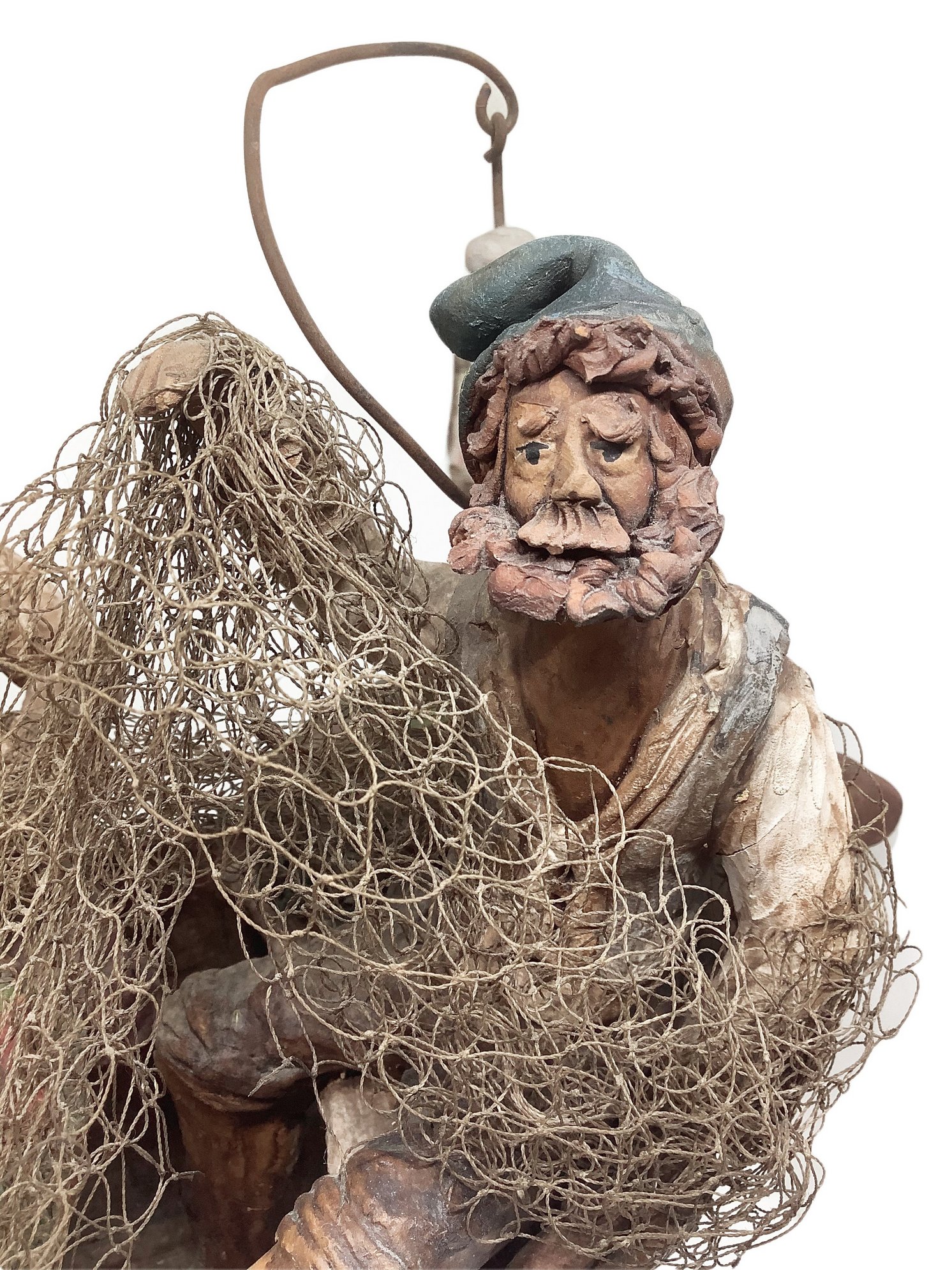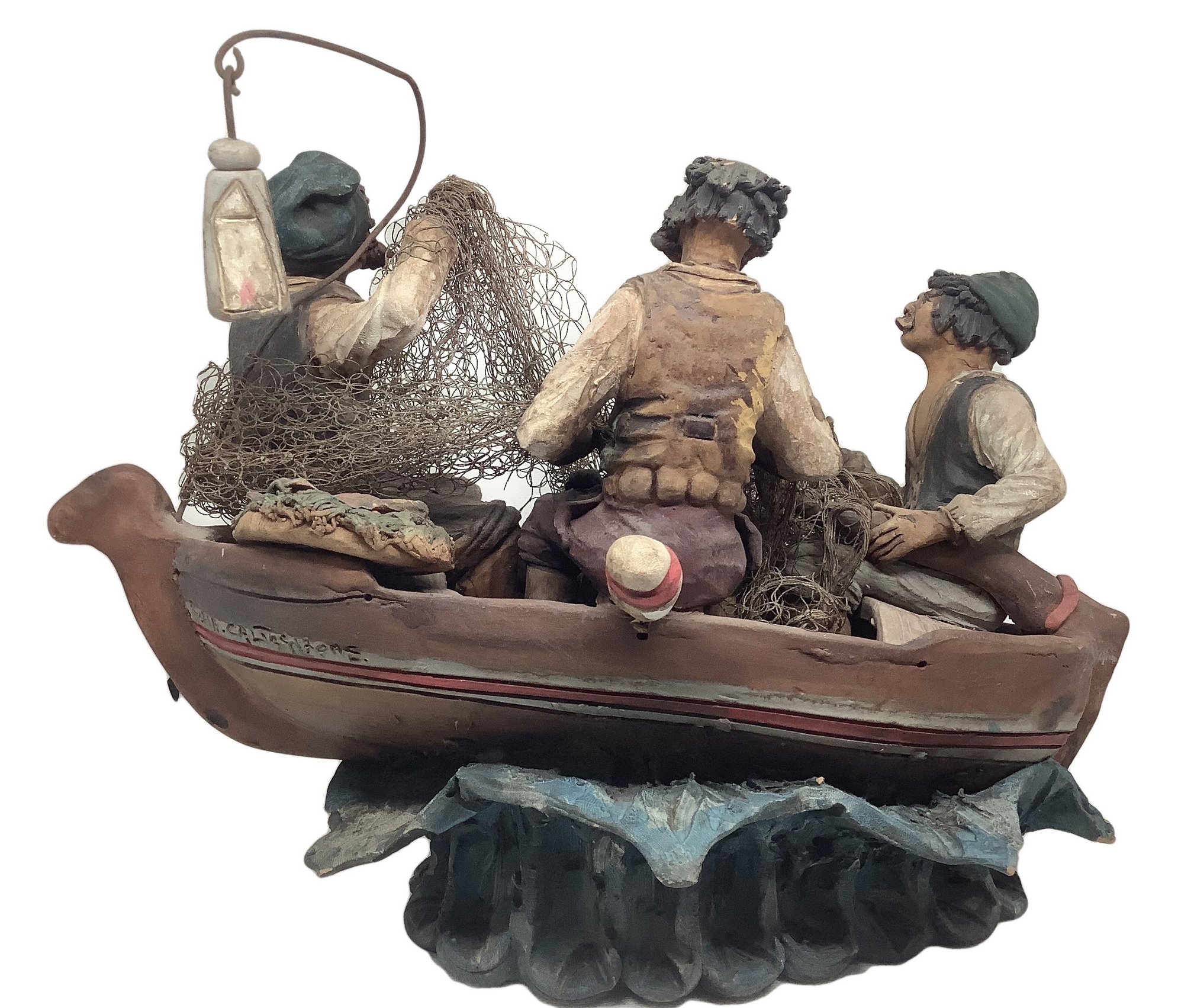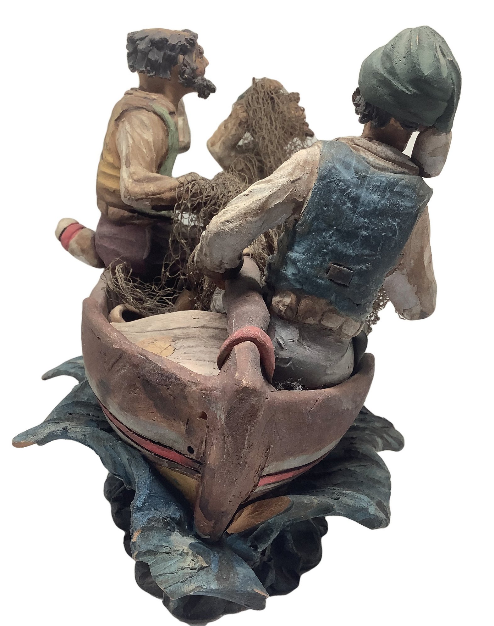 Gruppo scultoreo in terracotta policroma raffigurante tre pescatori in barca,...