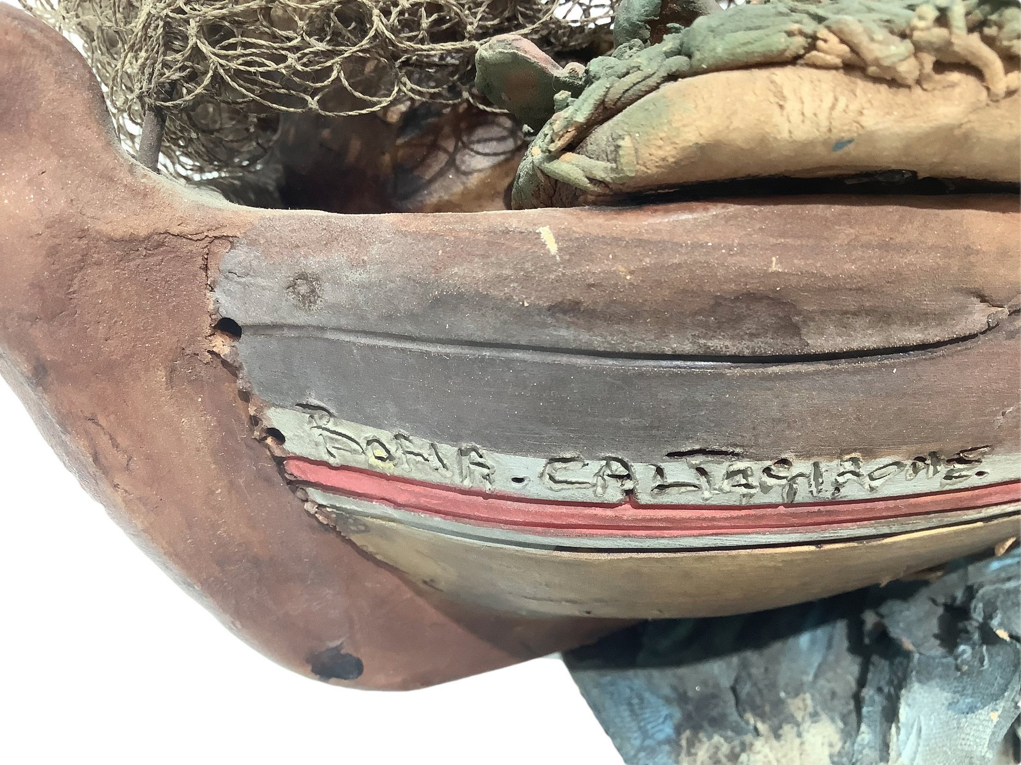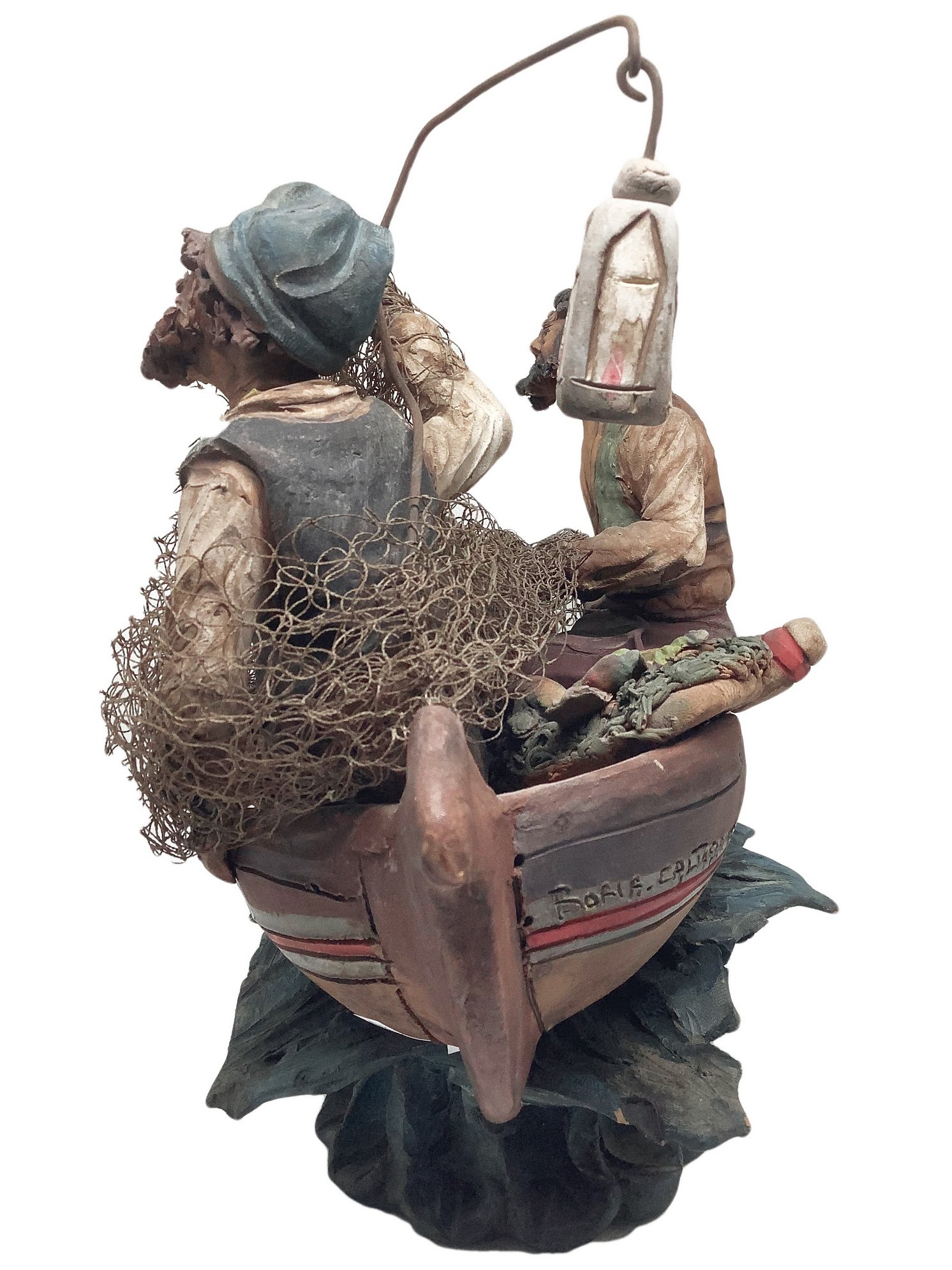 Gruppo scultoreo in terracotta policroma raffigurante tre pescatori in barca, anni '70. Firmato Boria Caltagirone. H cm 21. Base cm 31.