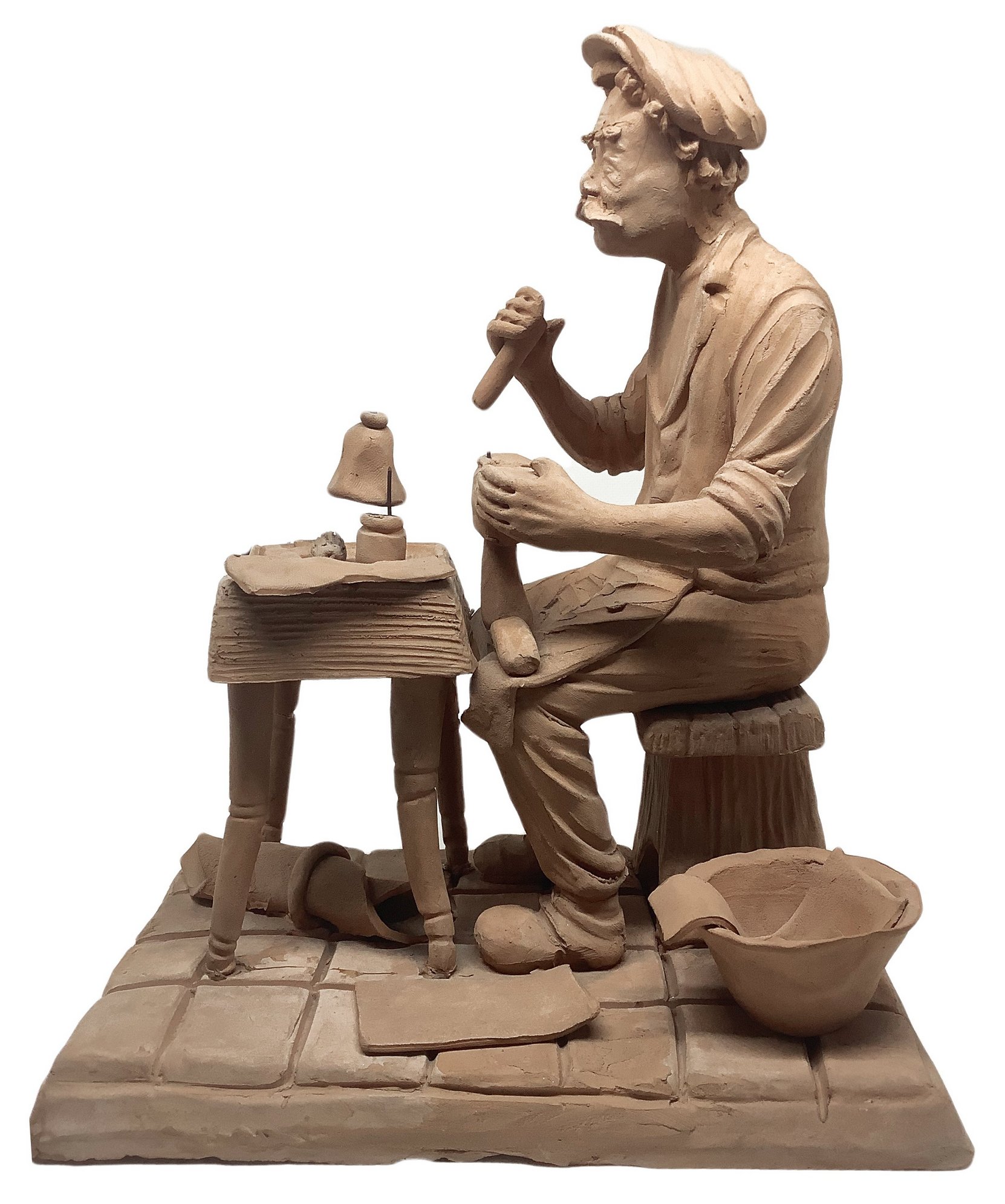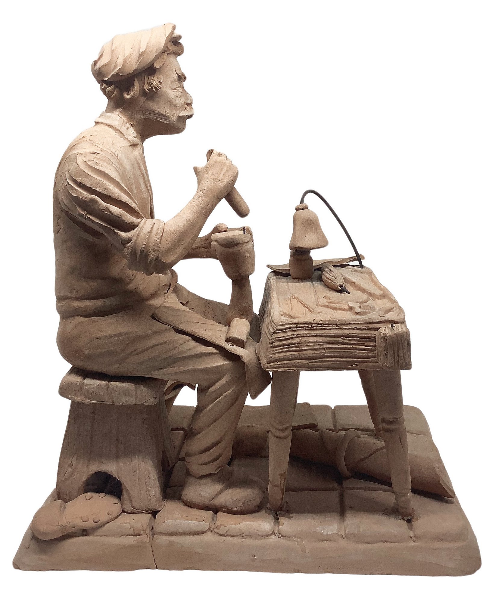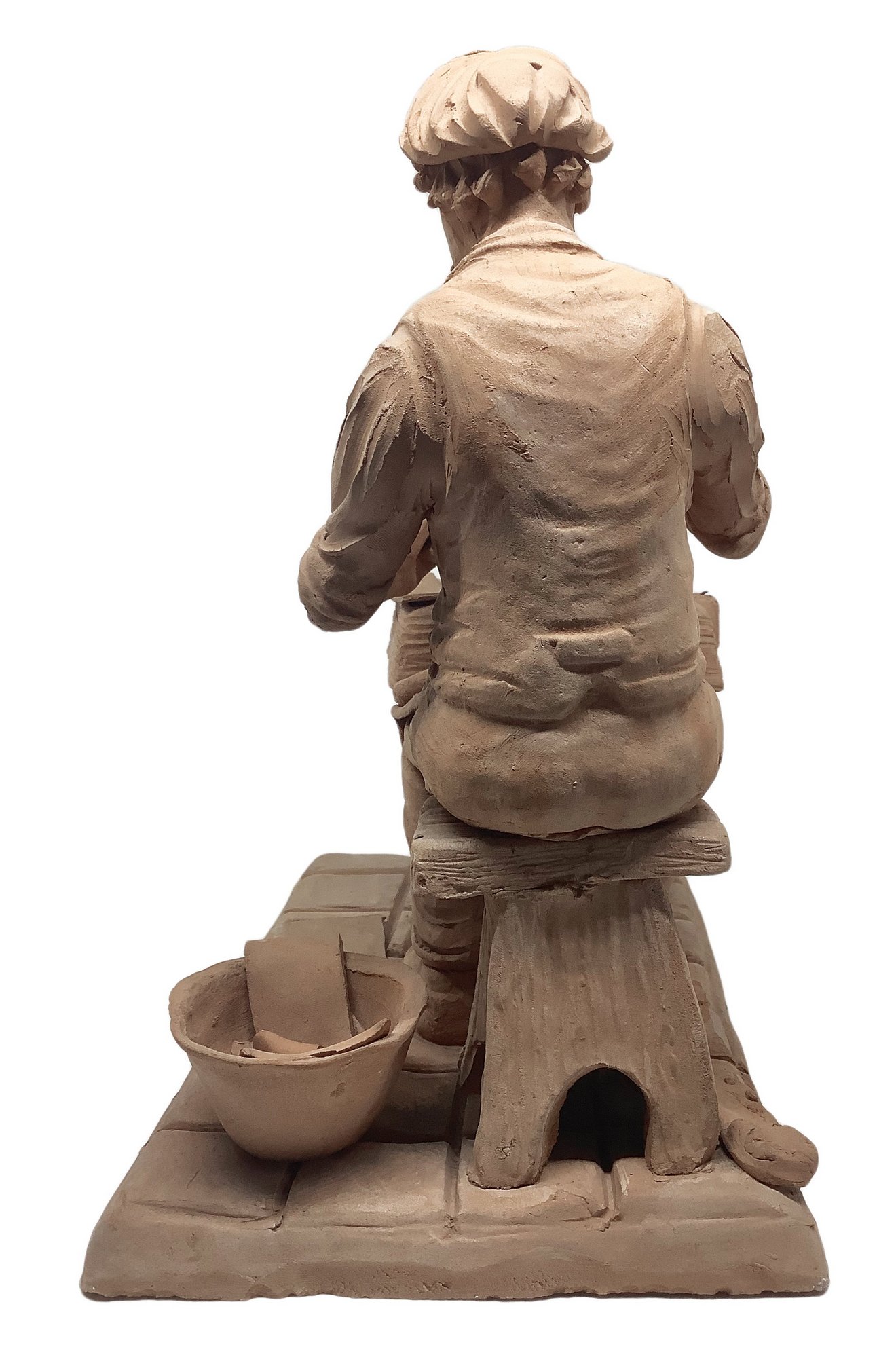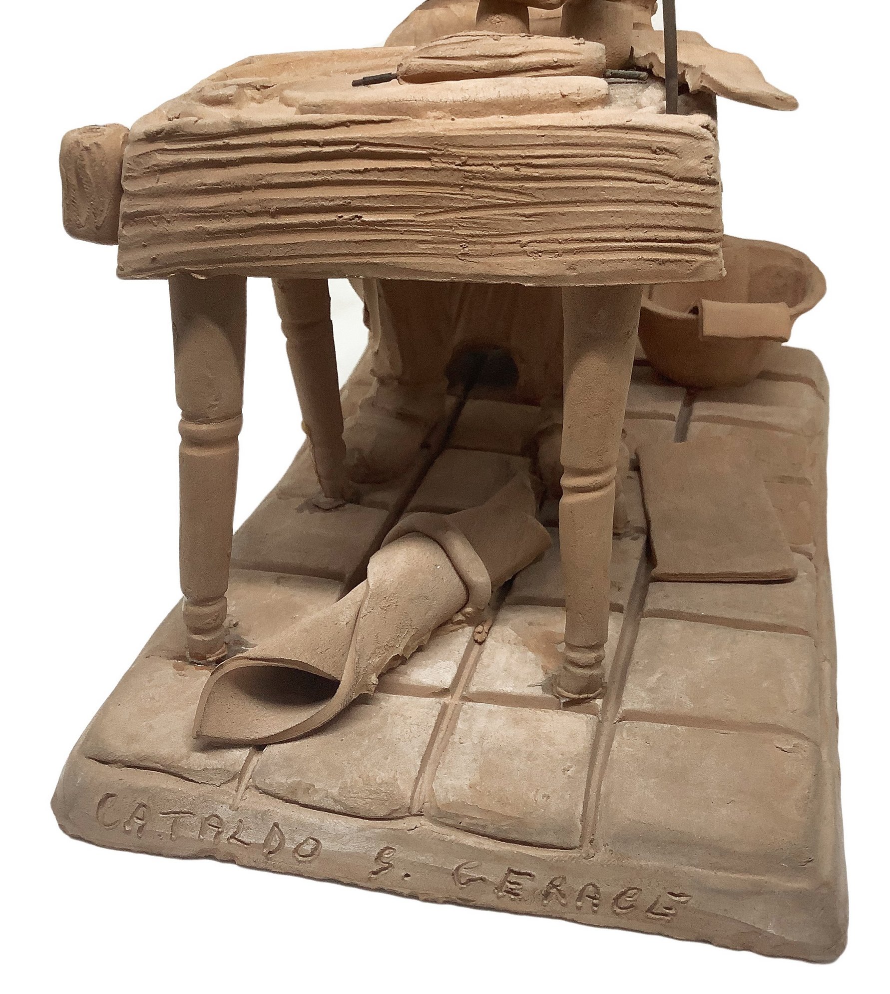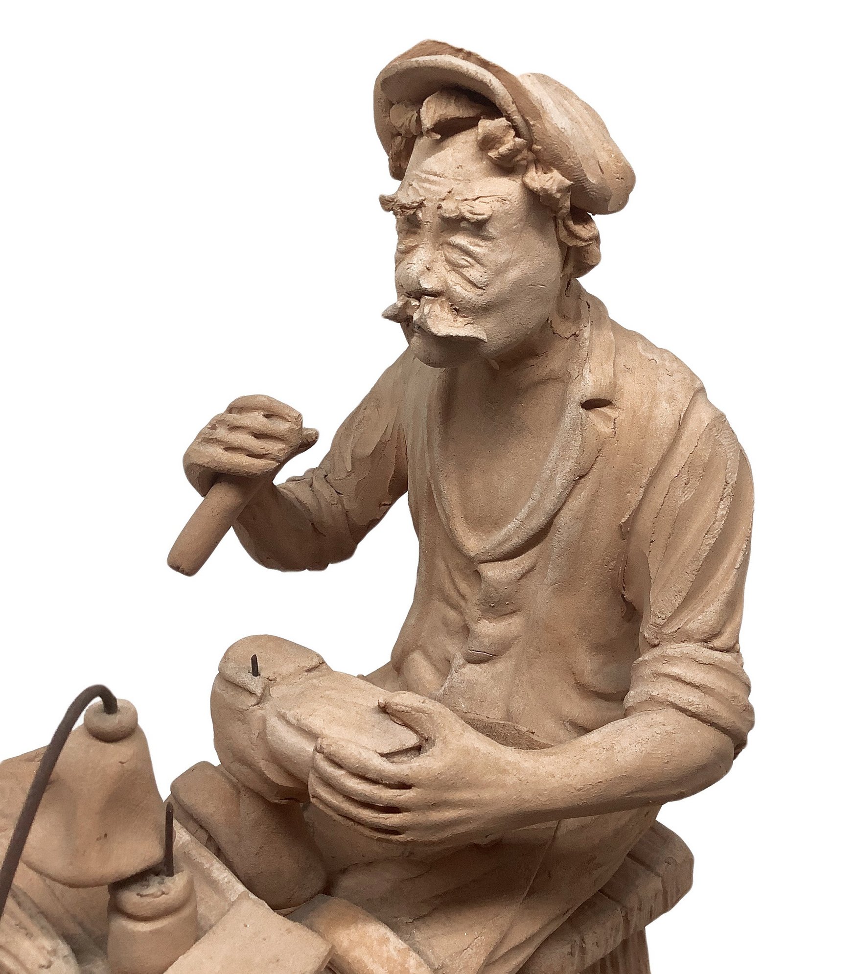 Figurina in terracotta monocroma raffigurante ciabattino al lavoro, XX secolo, Caltagirone. H cm 26, base cm 15x22. Firmato Cataldo S. Gerace alla base.