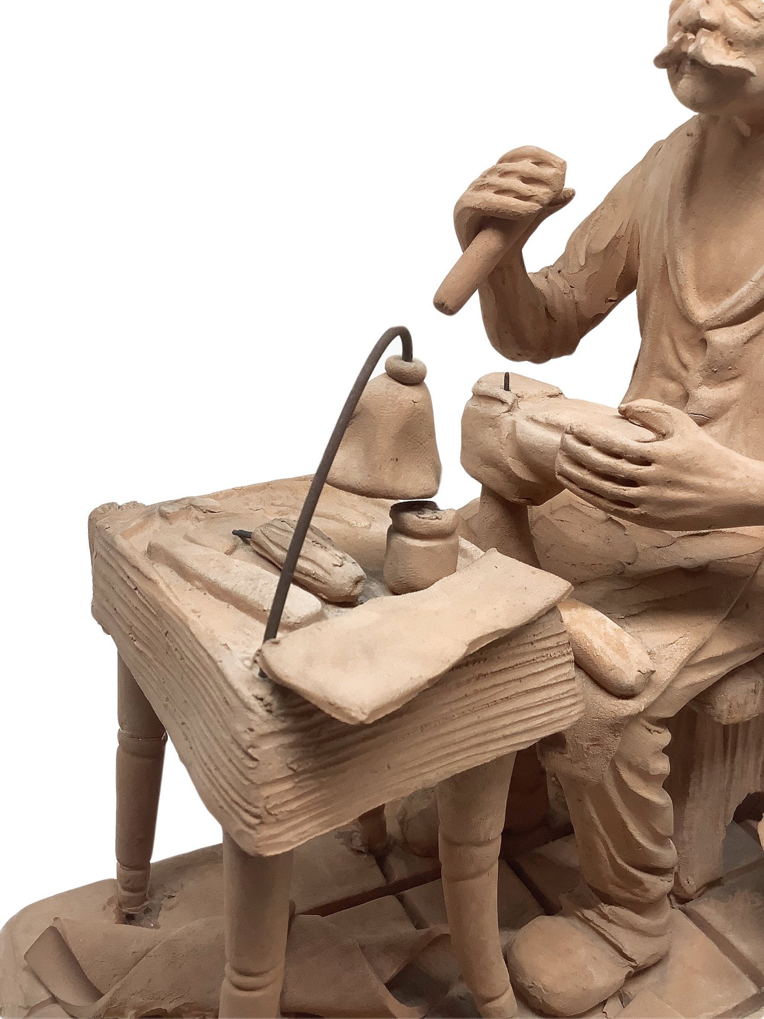 Figurina in terracotta monocroma raffigurante ciabattino al lavoro, XX...