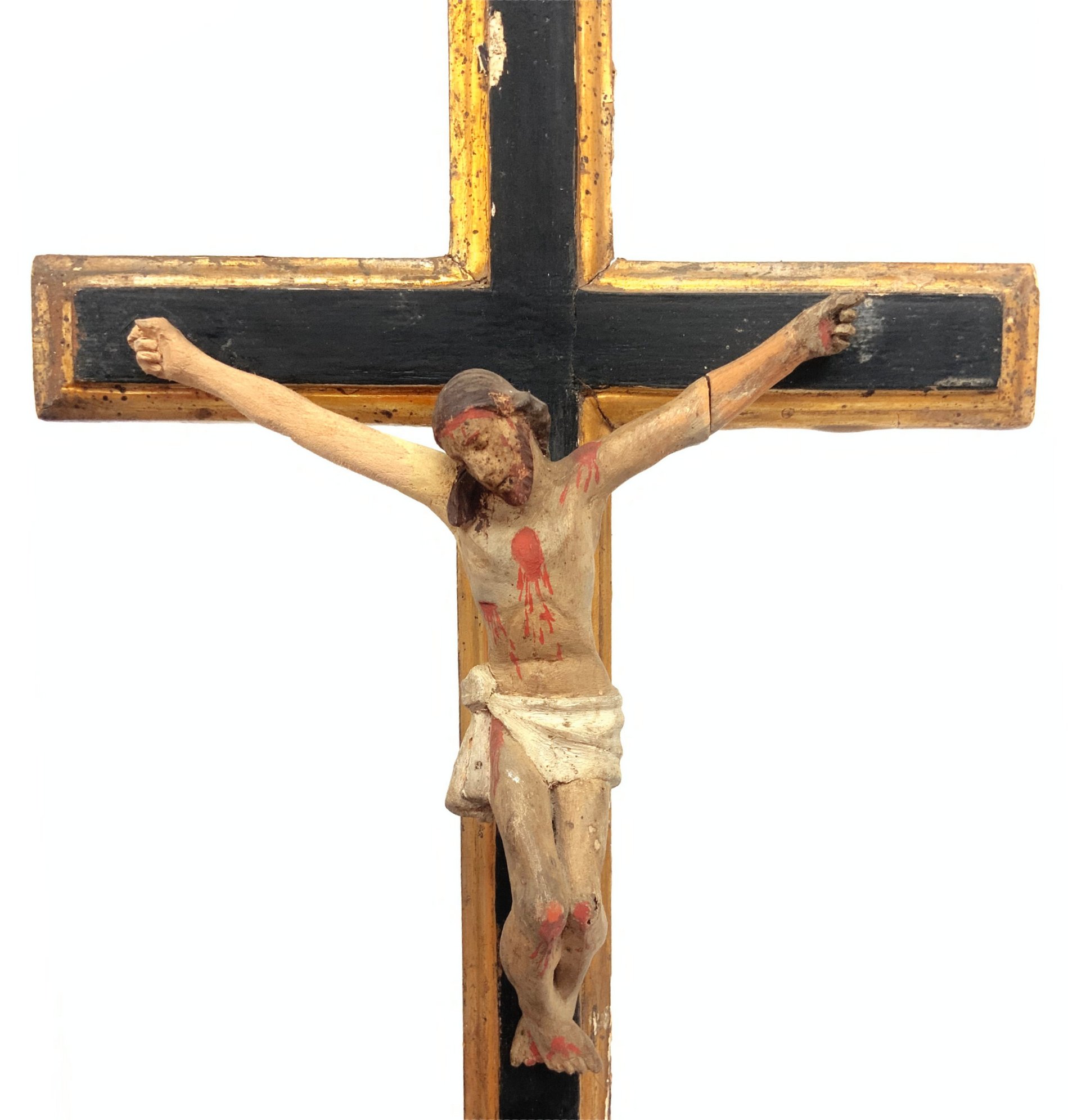 Crocifisso in legno su base raff. cuore di Gesù. Prima metà del XIX secolo. Sicilia.