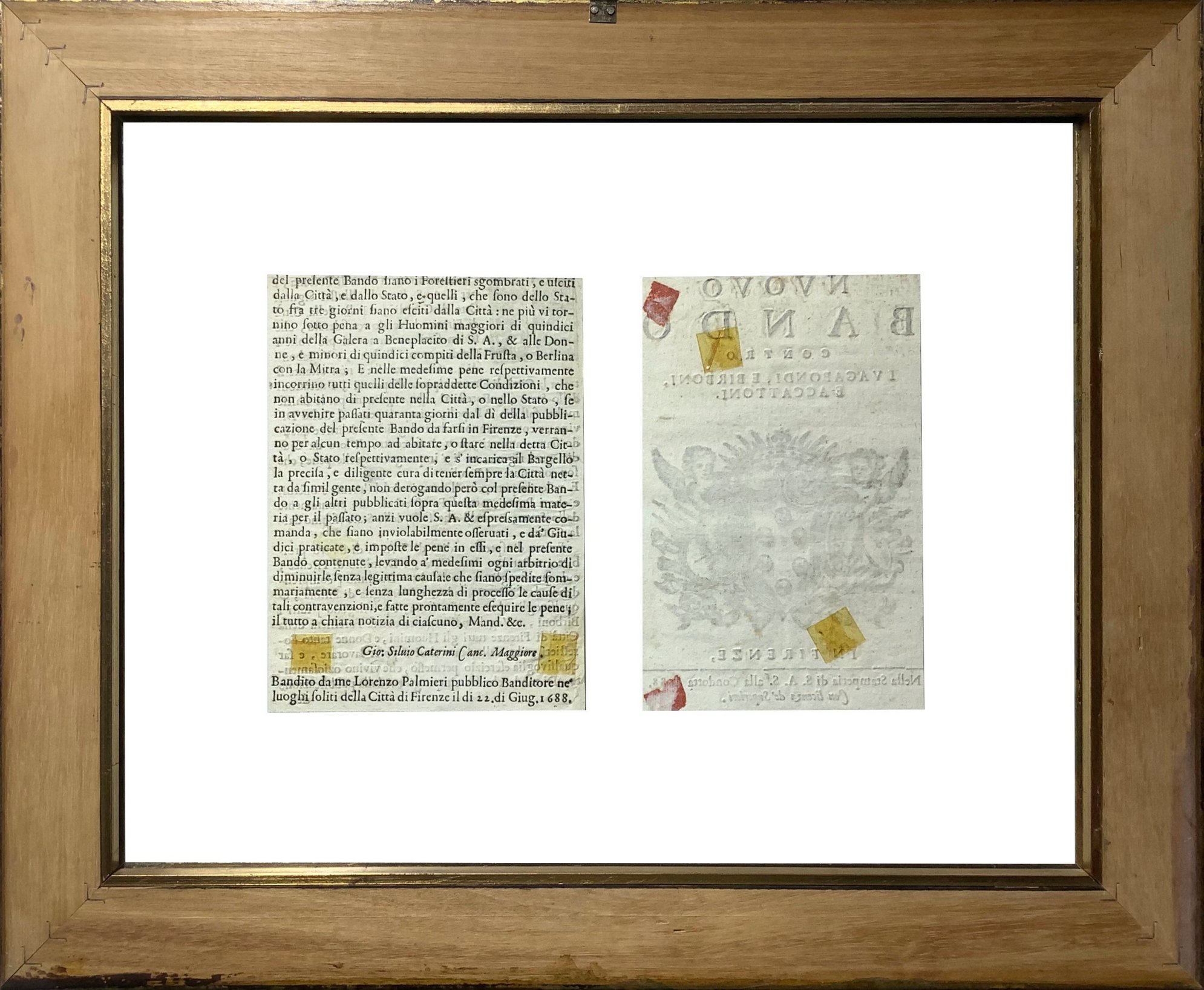 Stampa del nuovo bando contro i vagabondi e birboni e accattoni, 1688. Rifilata e ritagliata nei bordi. Cm 17x25. In cornice a giorno doppio vetro cm 37,5x46.