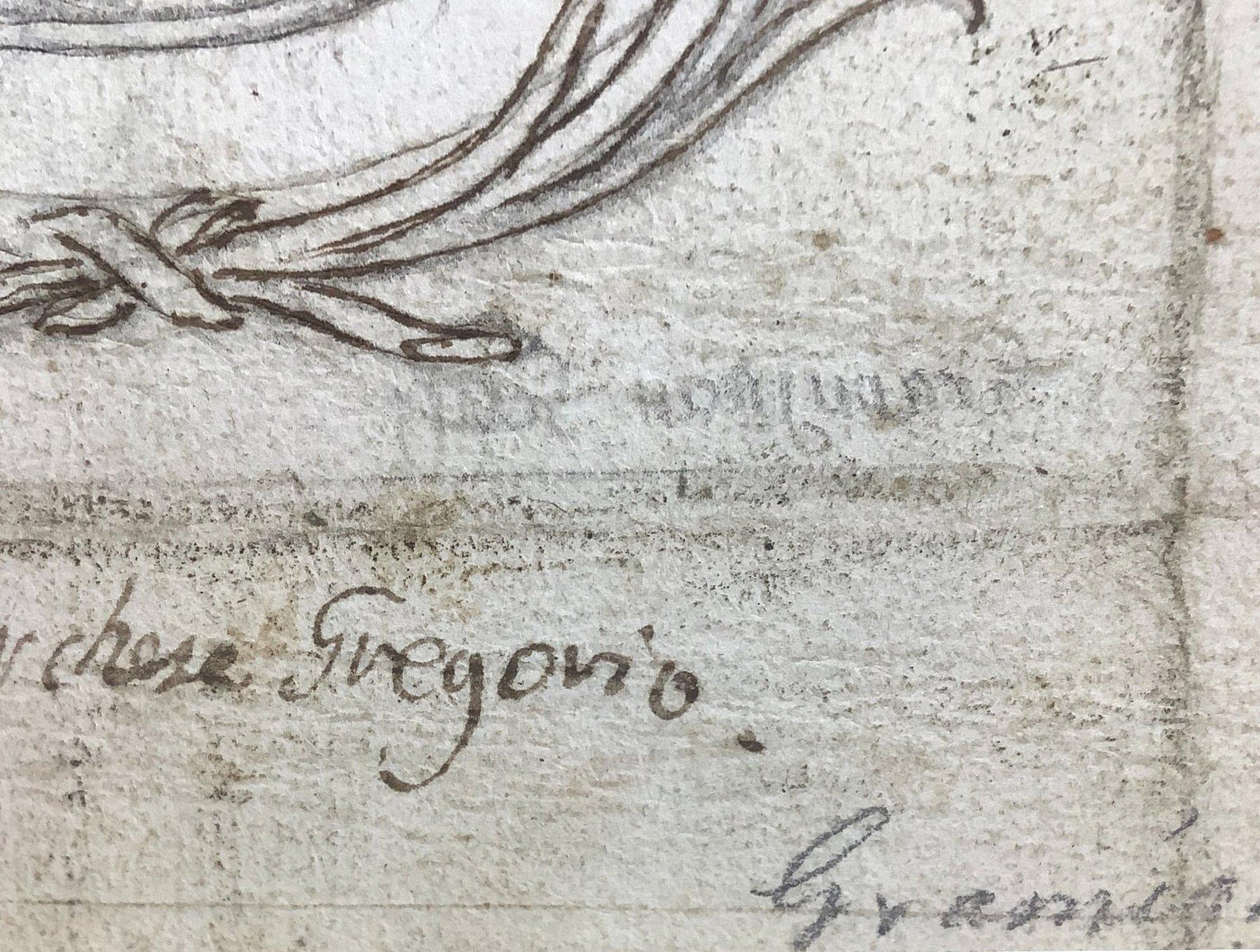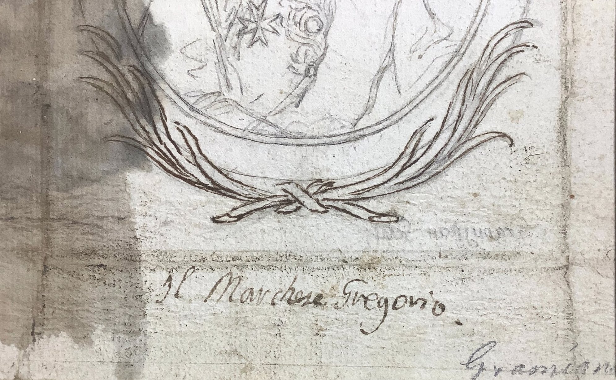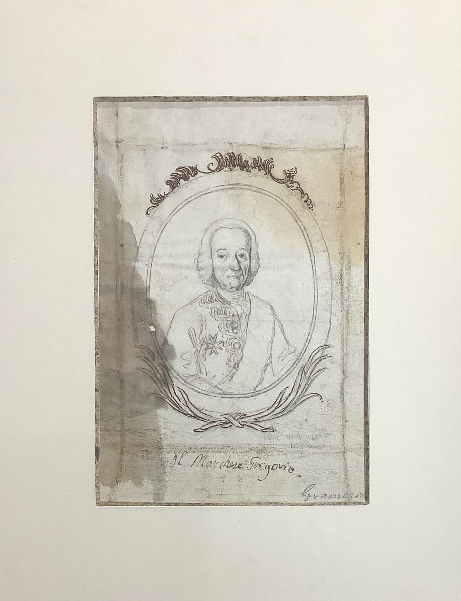 Disegno di Gramignani raffigurante il Marchese Gregorio. Disegno su carta a matita e inchiostro marrone. Mm 208x185. Firmato in basso a destra.