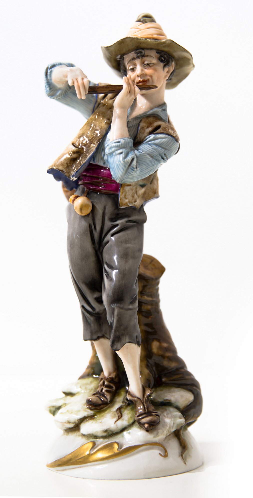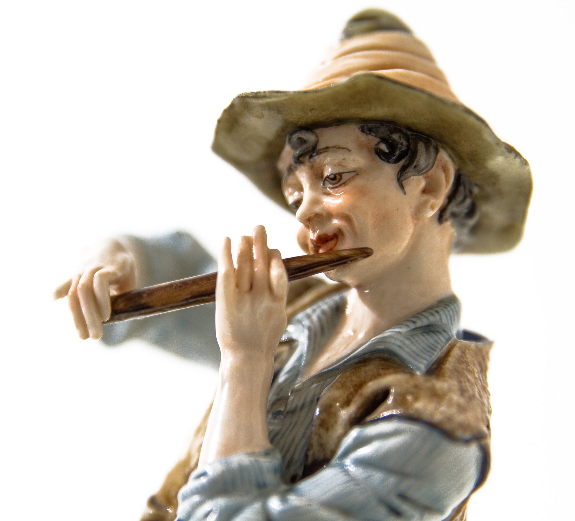 Statuina in porcellana di Capodimonte, Napoli, XX Secolo. Suonatore di flauto. H Cm 22. Piccole mancanze