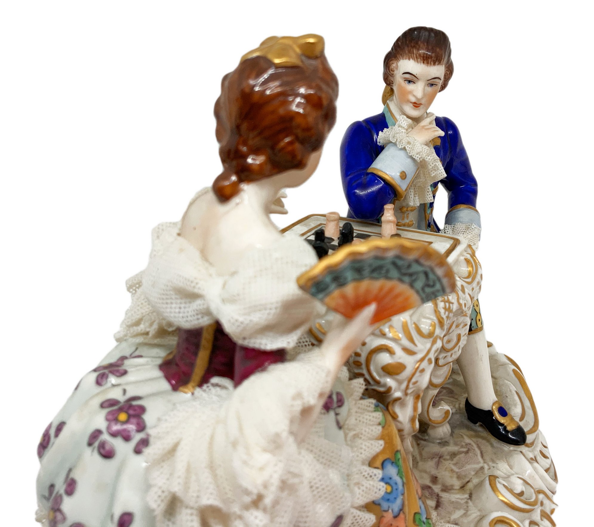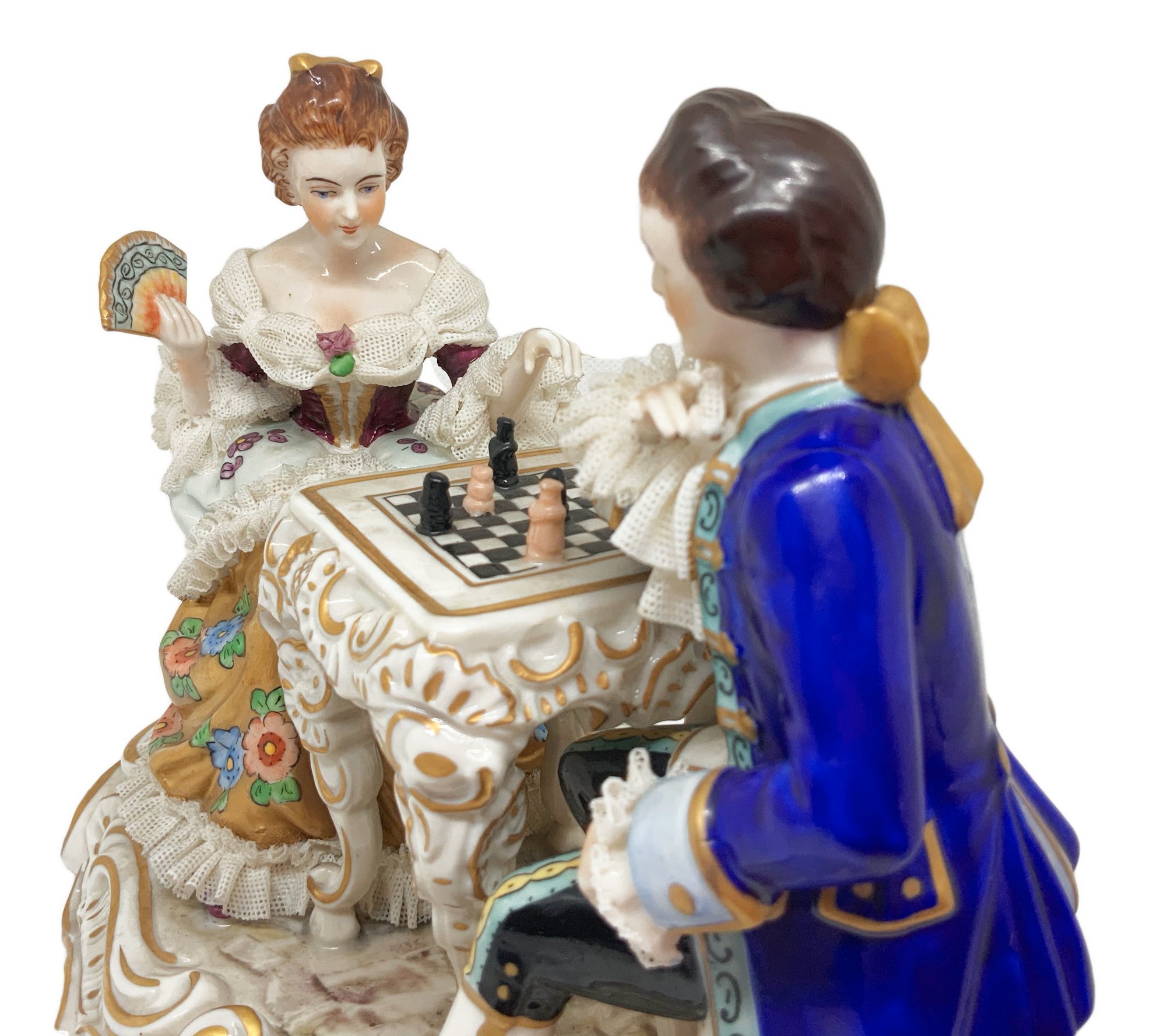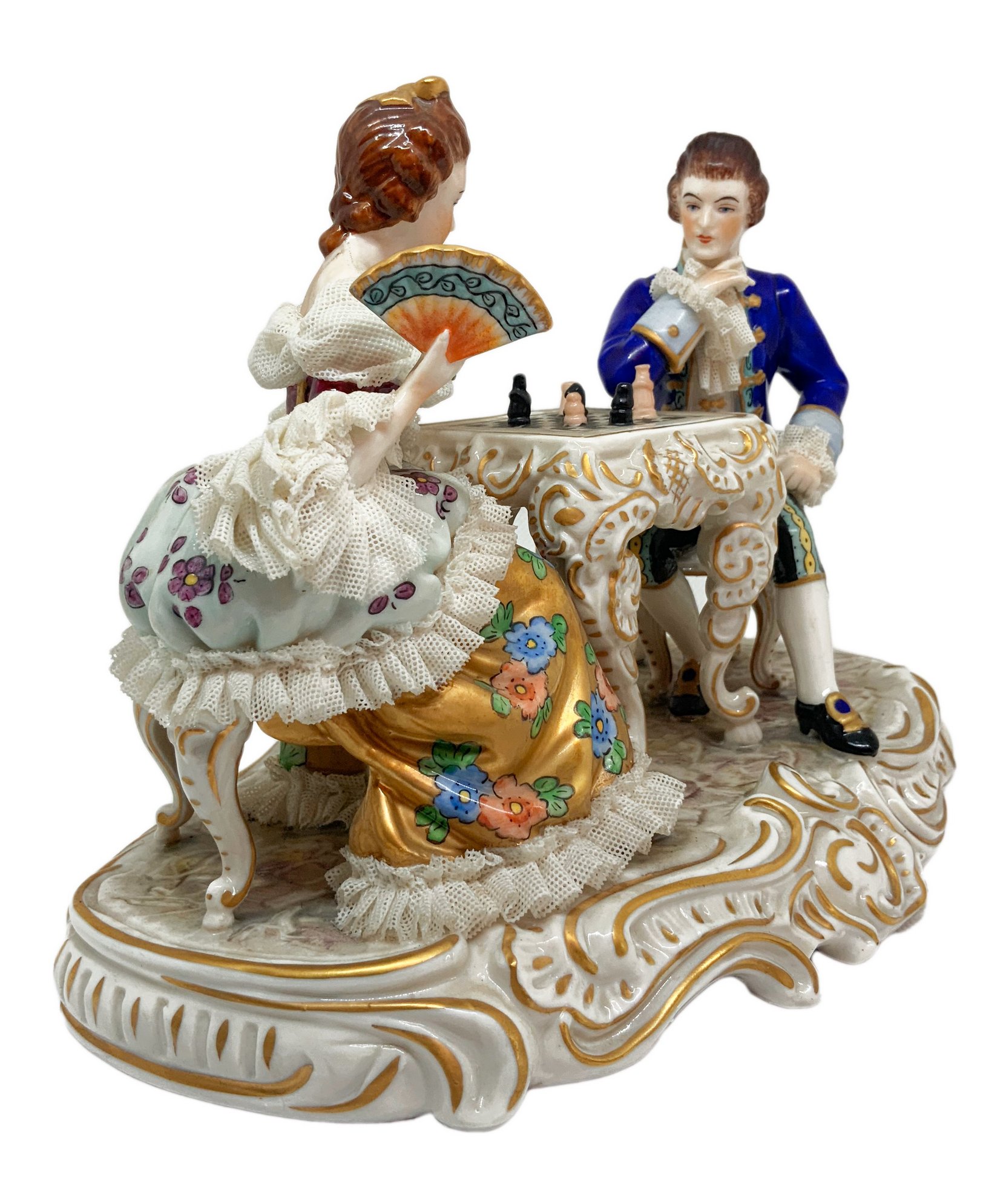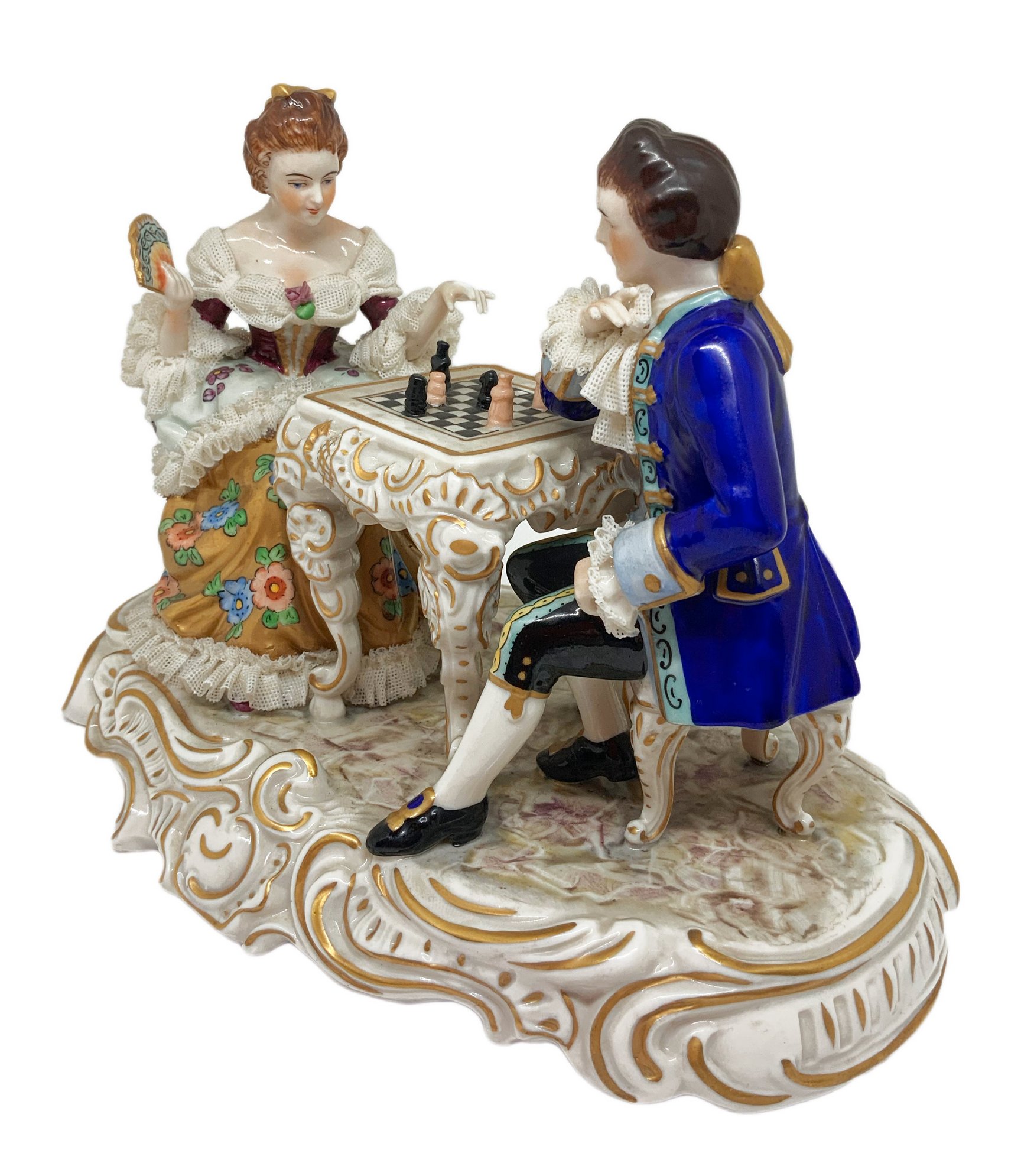 Statuina in porcellana di Capodimonte, Napoli, XX secolo. Giocatori di scacchi. H cm 16. Minime mancanze.